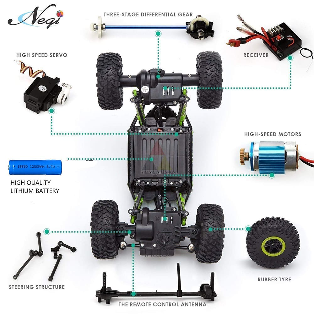 Solid frame chassis, high strength composite plastic is impact resistant to help protect the crawler 4 wheel drive makes it possible to drive on any road condition without getting stuck on larger obstacles along the way
