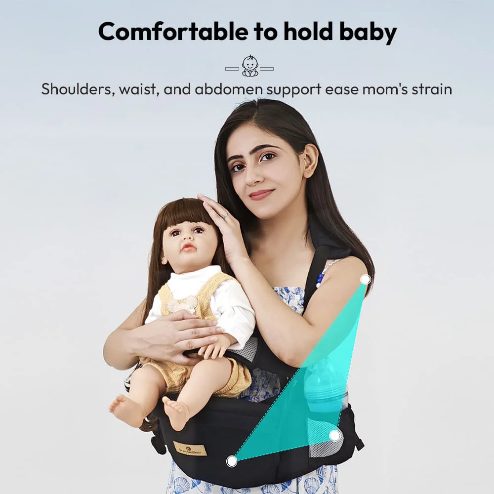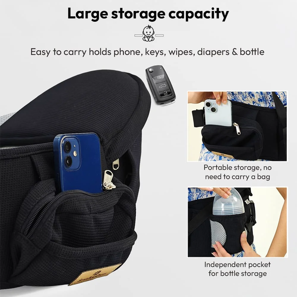 For parents on the go, the carrier features large storage capacity with independent pockets to carry essentials like phone, keys, wipes, diapers, and bottles eliminating the need for an extra bag. Built with durable polyester fabric, breathable mesh, and wide padded straps, it guarantees both comfort and strength.