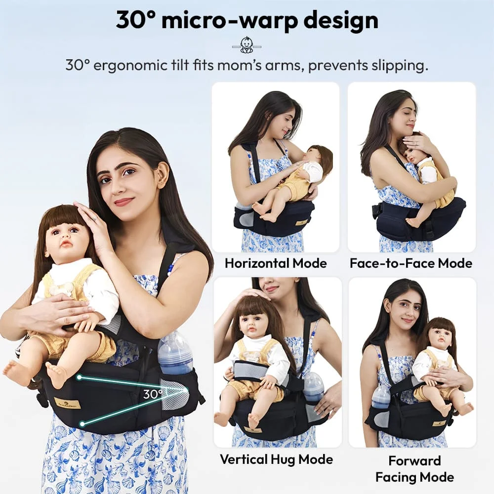 This versatile carrier offers multiple carrying positions including horizontal mode, face-to-face mode, vertical hug mode, and forward-facing mode, adapting to your baby’s growth and needs. With its 30° ergonomic tilt, the design naturally fits mom’s arms and prevents slipping, making baby holding more secure and comfortable.