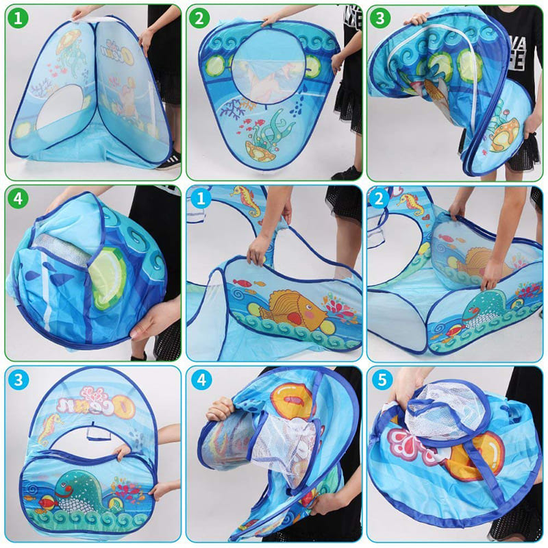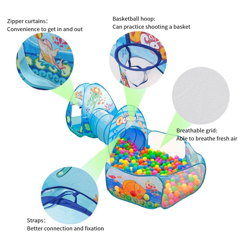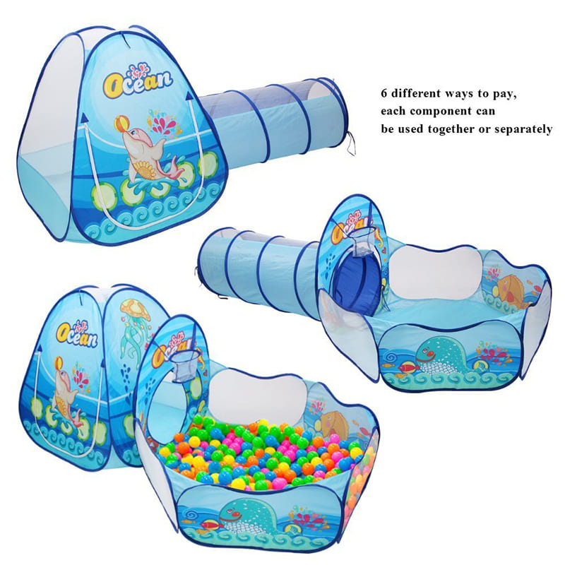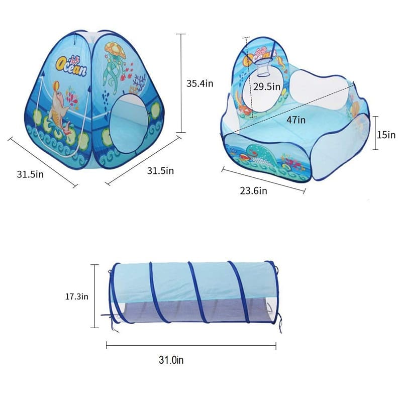 3-in-1 Pop Up Play Tent House with Tunnel & Ball Pool for Kids – Ocean Theme (Absorted Colour And Prints)