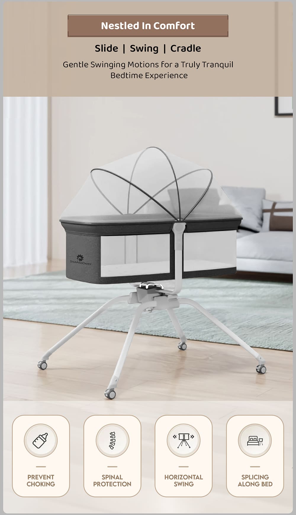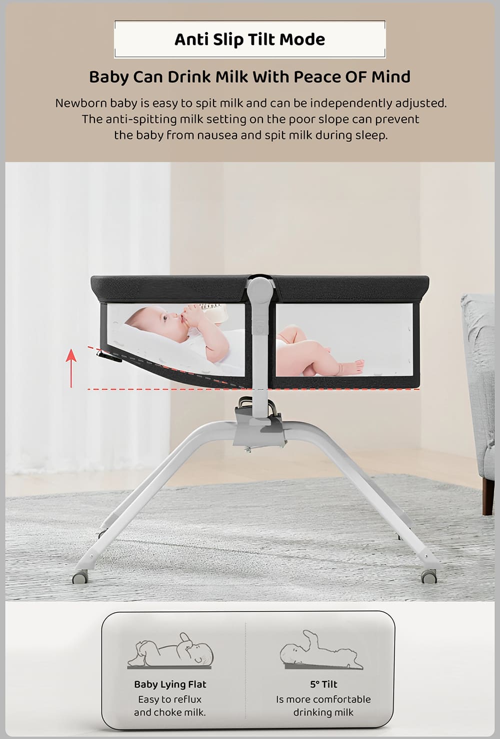 - Tilt Adjustment: The ability to adjust the inclination of the cradle is especially valuable during upper respiratory infections or when your baby is struggling with a pouring down problem