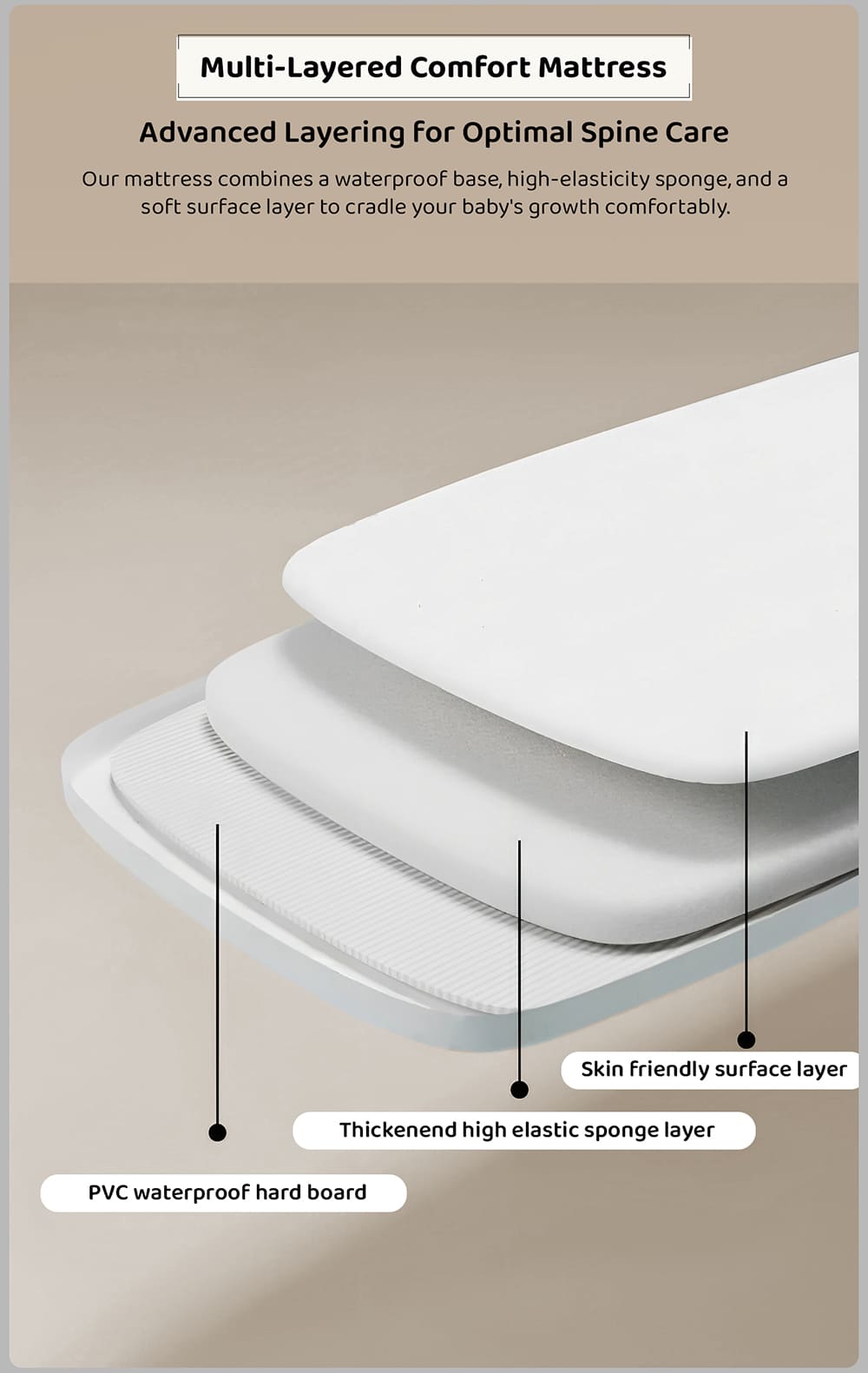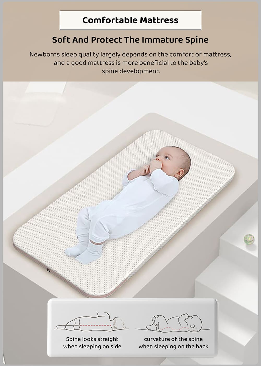 - Mattress: The cradle for the baby is equipped with a 3-layer, adequately firm mattress. Perfectly supports the baby’s back, ensuring a healthy, stable and comfortable position during sleep