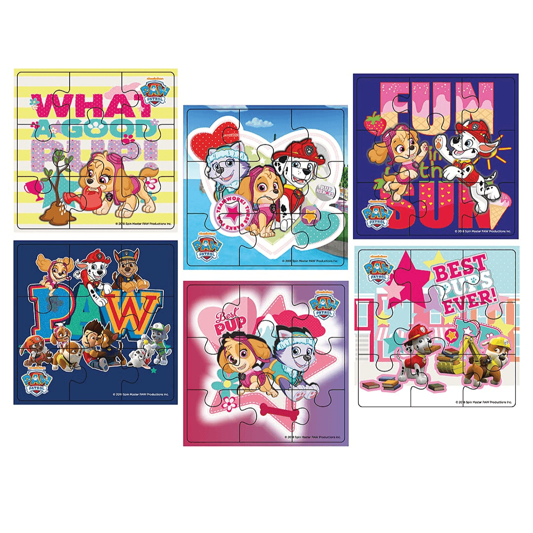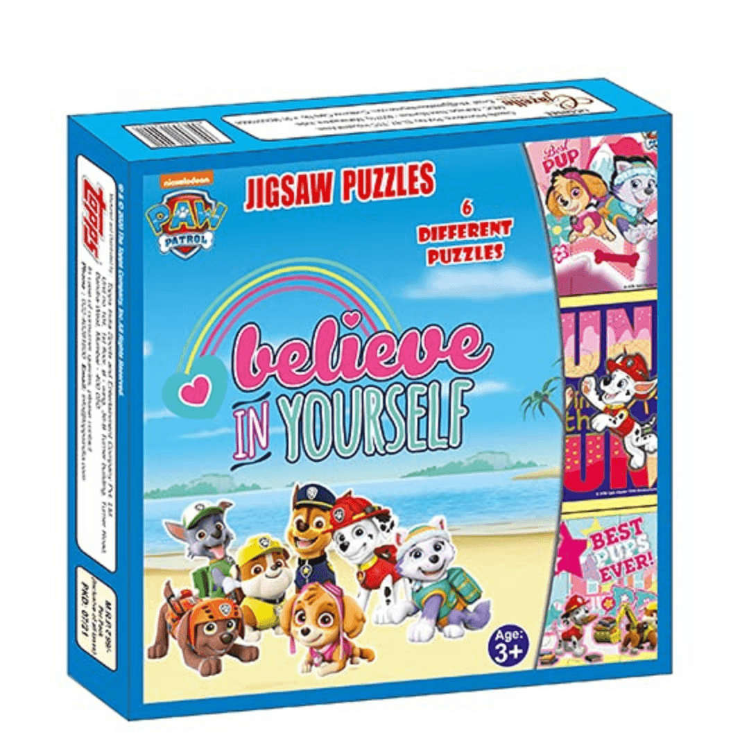 Introducing Topps Jigsaw Puzzle Paw Patrol 6 in 1! Join your favourite heroic pups on exciting adventures with this delightful collection. Each puzzle contains 9 pieces, perfect for young fans to develop their skills while having fun. Piece together Chase, Marshall, Skye, and more in vibrant illustrations. Get ready for endless playtime enjoyment at home or on-the-go with Paw Patrol!
