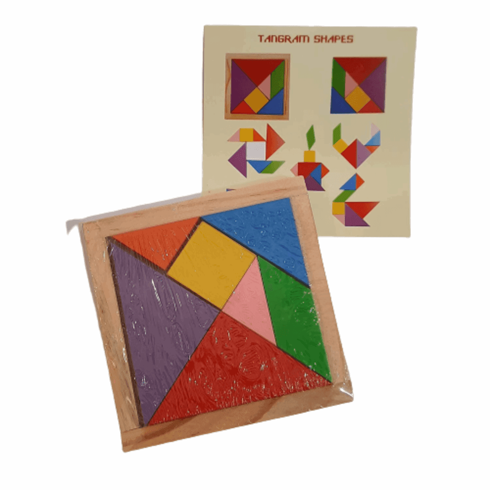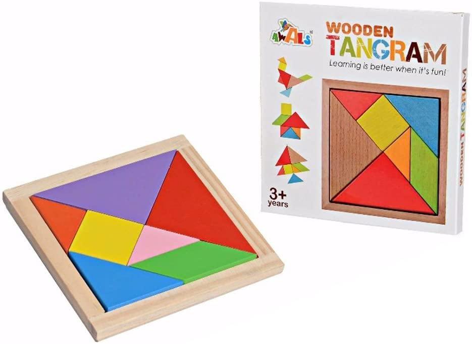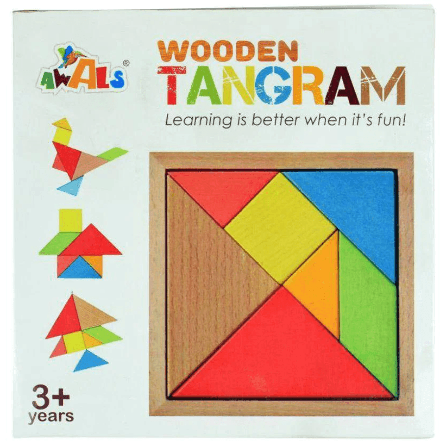 Awals Wooden Tangram is a traditional Chinese puzzle game consisting of seven geometric pieces. The pieces include two large right-angled triangles, one medium-sized right-angled triangle, two small right-angled triangles, one square, and one parallelogram. The objective of the game is to use all seven pieces to form a specific shape or figure, such as an animal, object, or person. The pieces can be rotated and flipped but cannot overlap or leave any gaps.