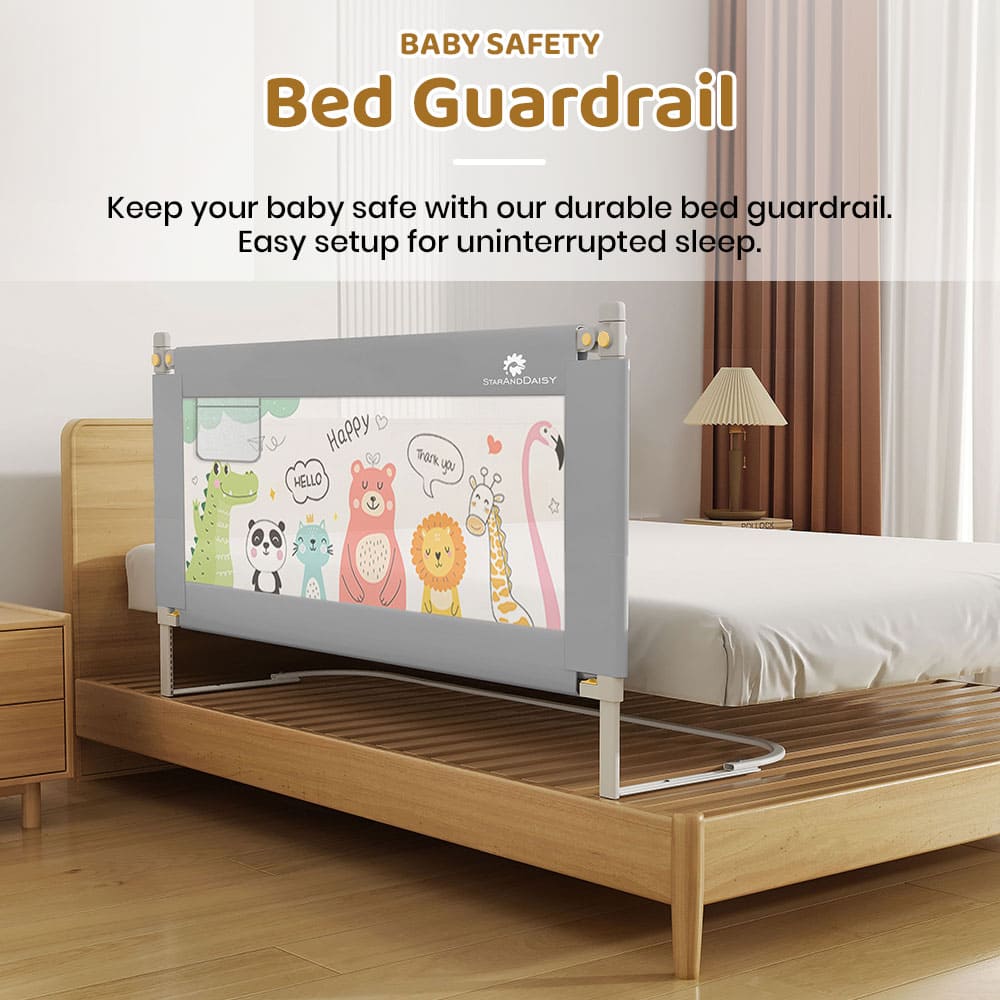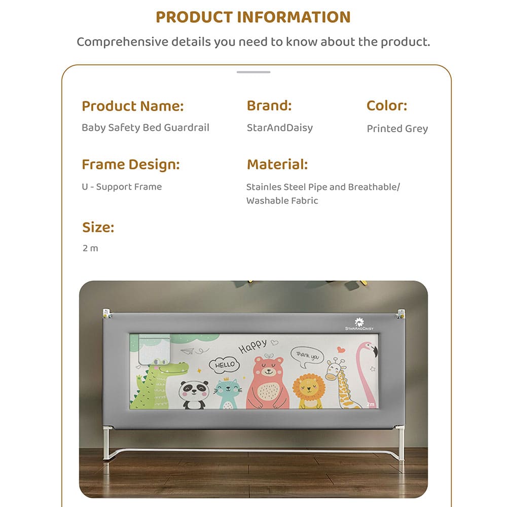 StarAndDaisy Baby Bed Guardrail with Adjustable Heights, Safety Bed Fence & Anti-Fall Bed Guards for Babies – U-Full Body Support Frame 2M (Printed Grey)