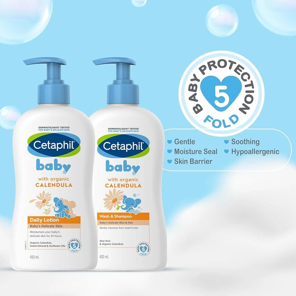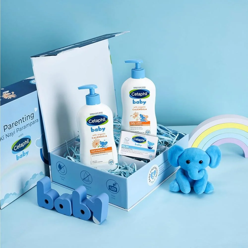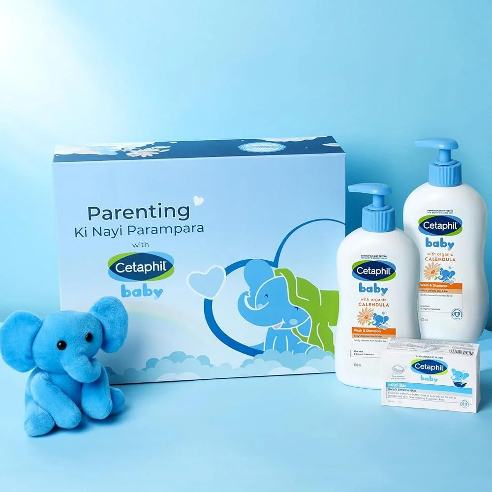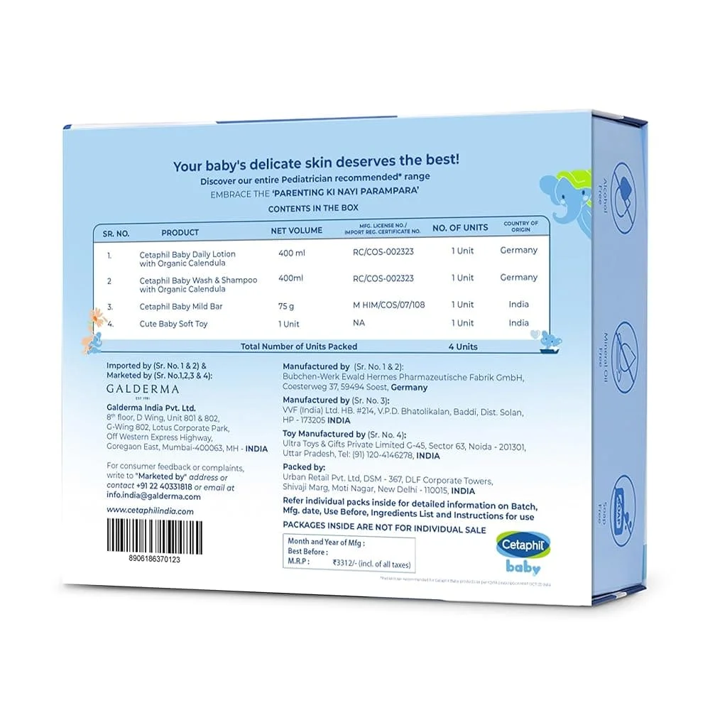 Cetaphil Baby Gift Pack with Soft Toy – Calendula Comfort Essentials (Daily Lotion 400ml, Wash & Shampoo 400ml, Mild Bar 75g)