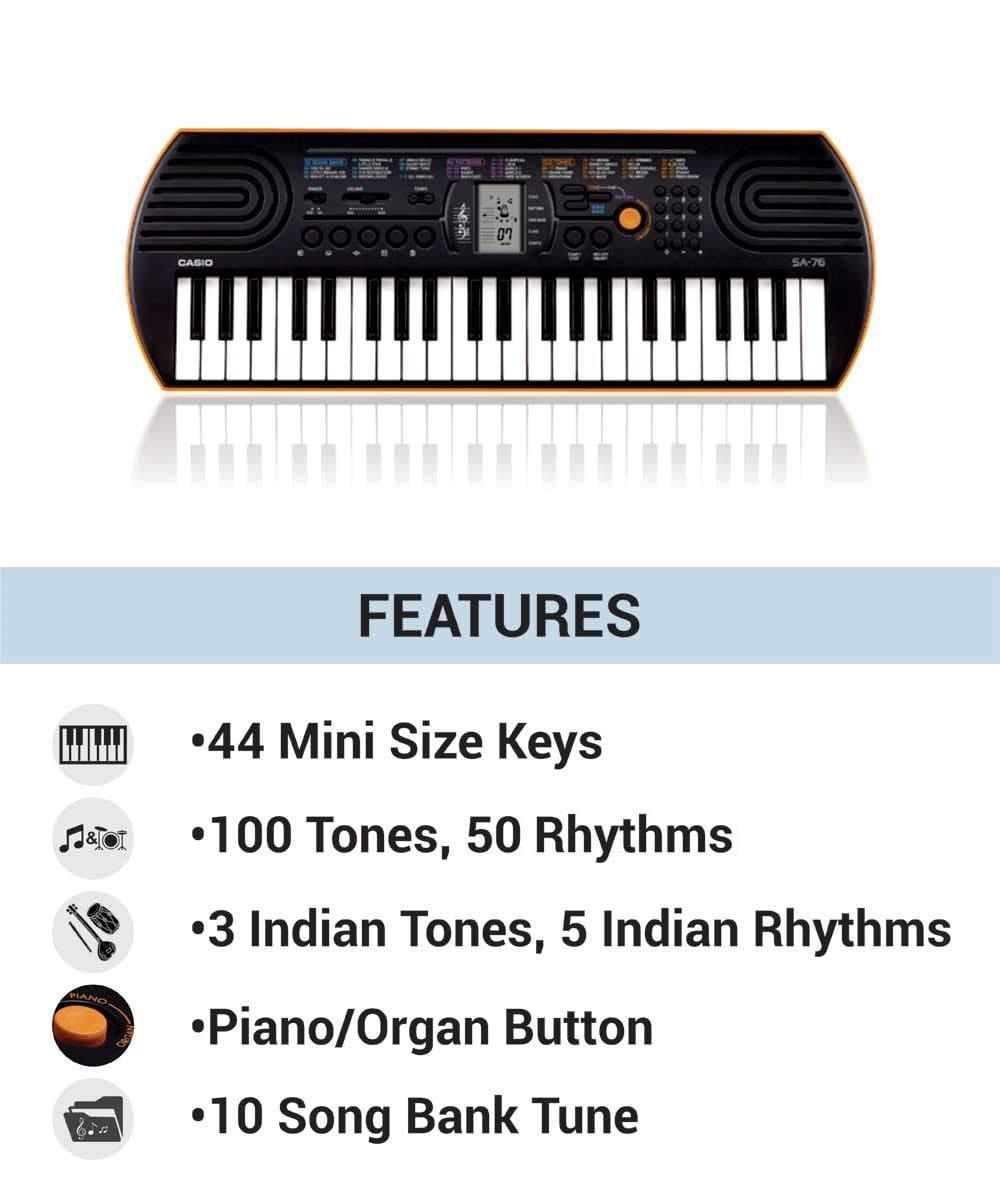 Start your child’s musical journey with the Casio Musical Keyboard SA-76. This mini keyboard features 44 mini sized keys, perfect for kids. With 100 tones and 50 rhythms, your child can explore a variety of lifelike instruments. The SA-76 also includes 10 built-in songs to play along with, as well as 5 on-board percussion pads and a piano/organ button.