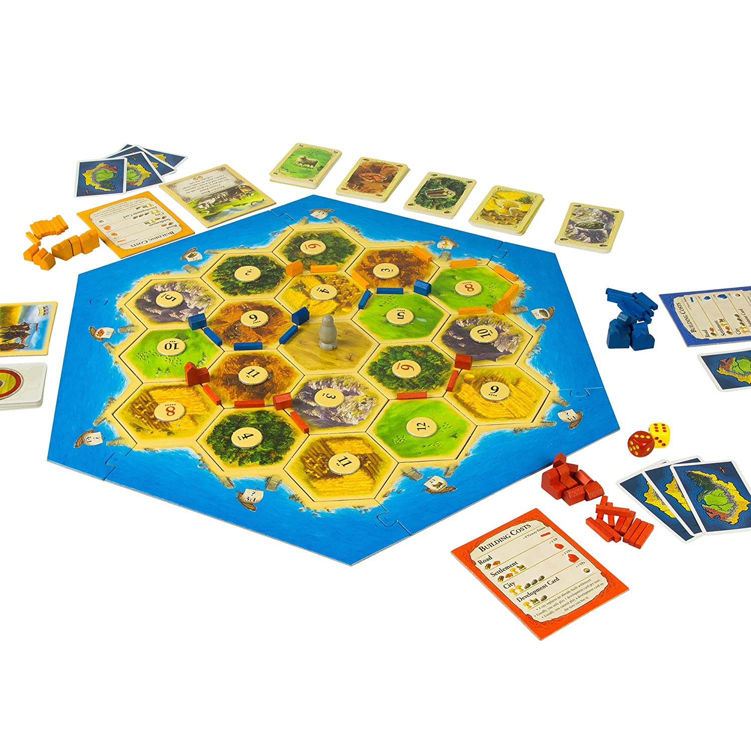 To begin the game, we build the game board using hexagonal terrain tiles. Catan is born – a beautiful island with mountains, pastures, hills, fields, and forests, surrounded by the sea.