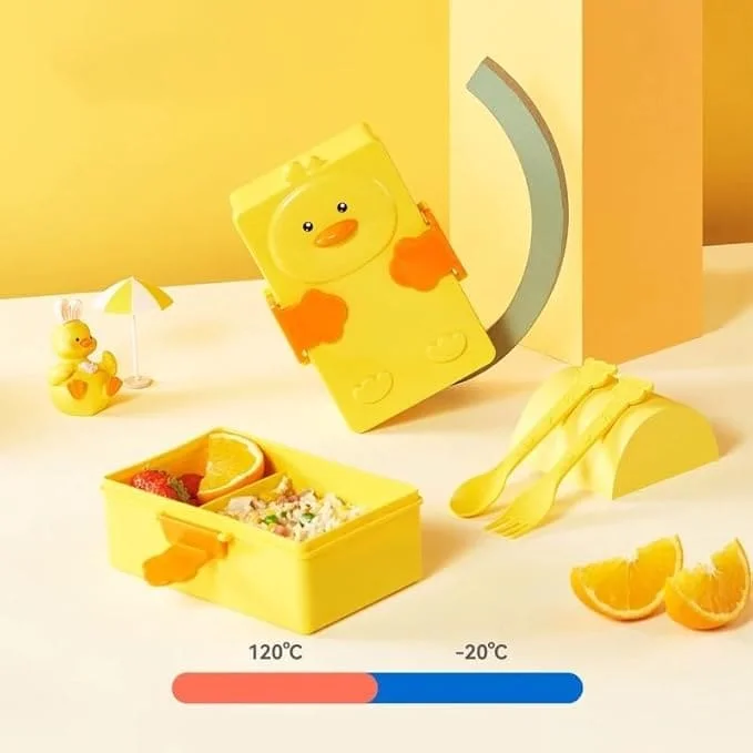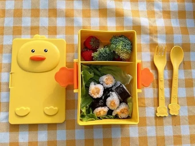 Cherry lunch box for kids with Double-Compartment, Duck Cartoon Lunch Box with Spoon and Fork BPA Free-Yellow