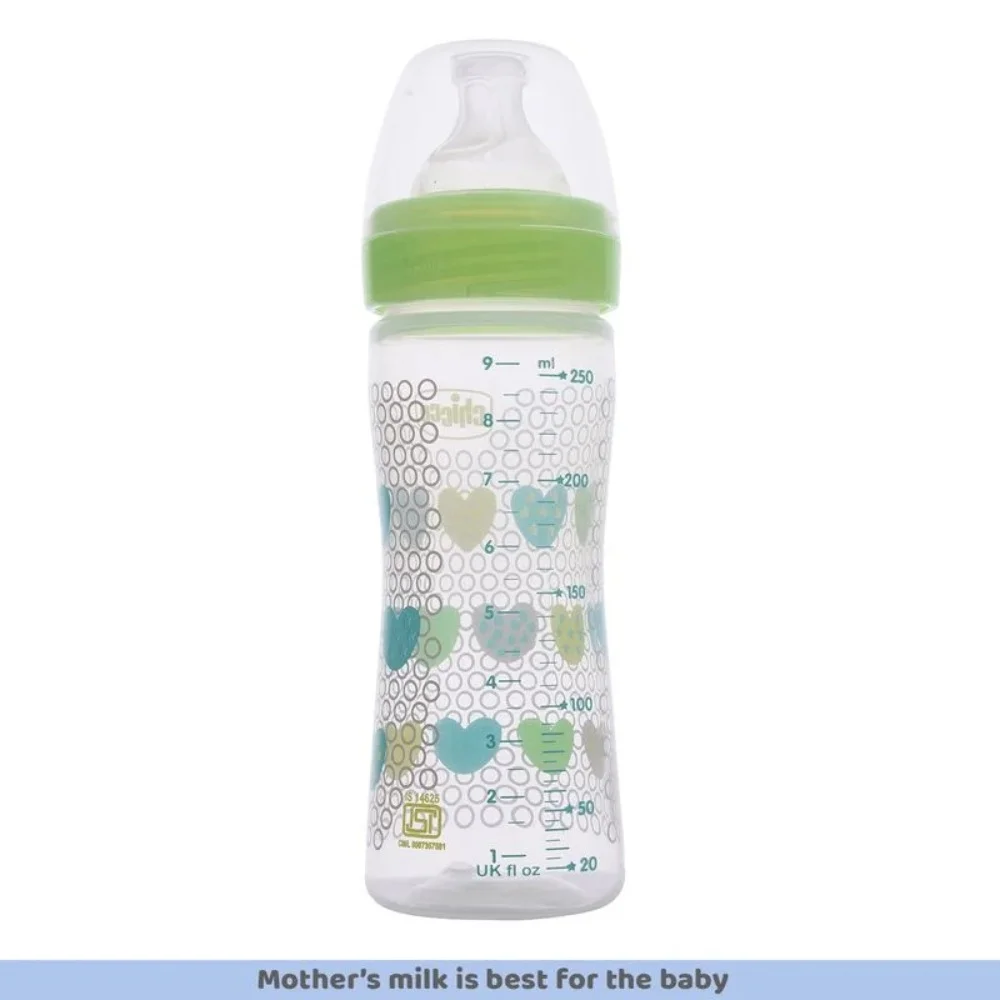 Chicco Well-Being Feeding Bottle 250ml (Medium Flow) in Green is the perfect choice for a relaxed and comfortable feeding experience. Designed to protect babies from colic and regurgitation, the bottle features the New Advanced Soft Silicone Physio Teat that provides a natural mum-like feel and supports easy transition between breastfeeding and bottle-feeding. Suitable for babies aged 2 months and above.