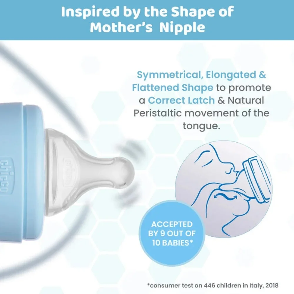 - Symmetrical, elongated, and flattened Physio teat to encourage a correct latch and natural sucking.