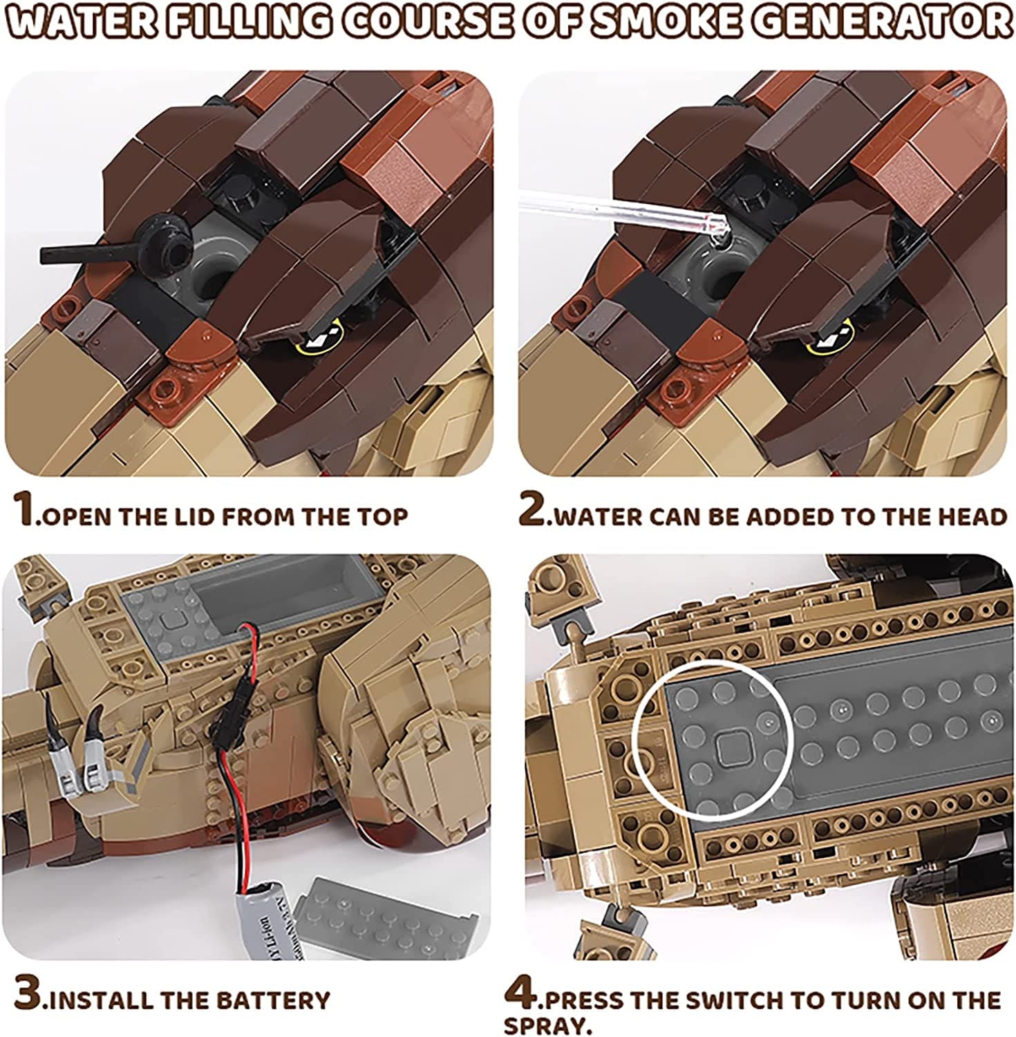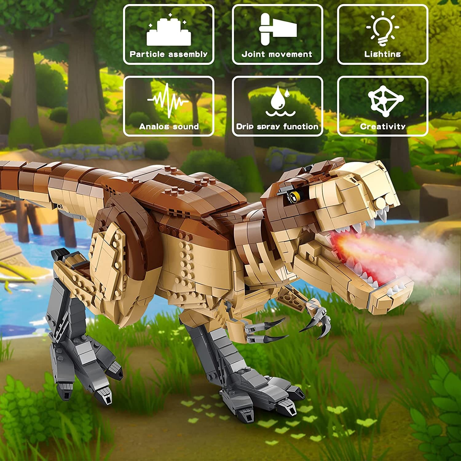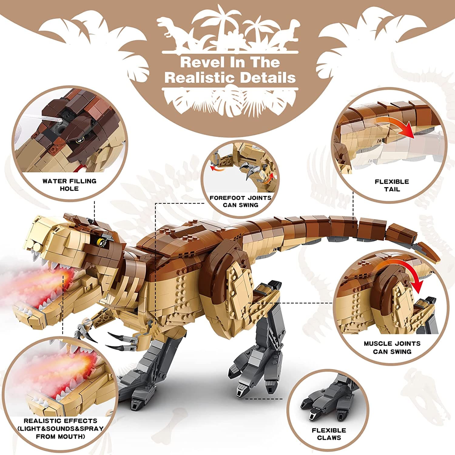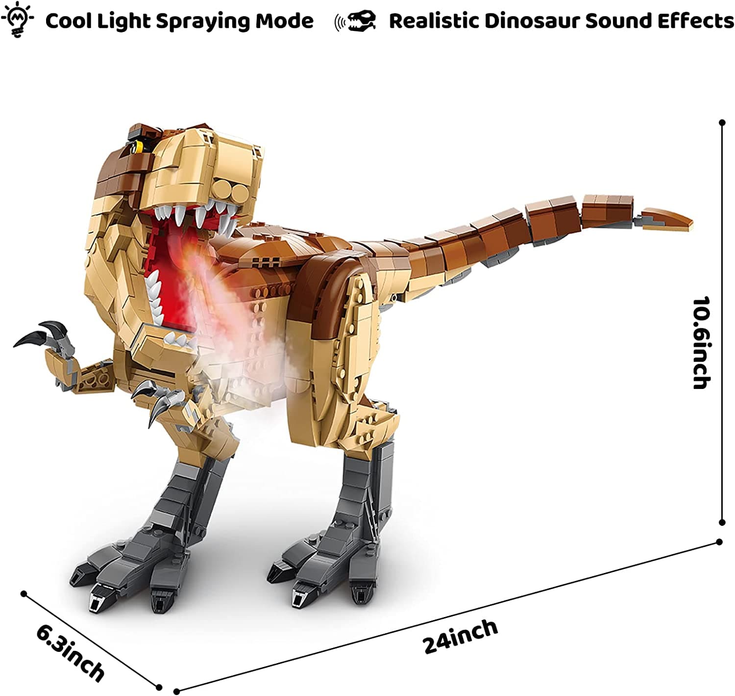 The legs of the dinosaur building blocks can swing; the tail can rotate flexibly, and the mouth can open, spray and mimic dinosaur sounds. Open the lid from the dinosaur toy top, and add water to the dropper. Install the battery and press the switch on the spray model. It’s very attractive to boys aged 6-10 and up.