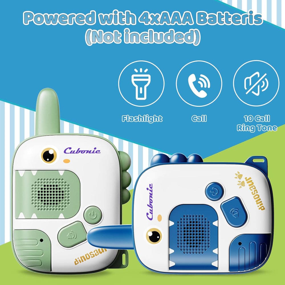 Let your little explorers enjoy endless adventures with the Cubonic Dinosaur Walkie Talkies for Kids (2-Pack). Designed in adorable green and blue dinosaur themes, these kid-friendly walkie talkies offer a long communication range of up to 1000 ft, making them perfect for both indoor and outdoor play.