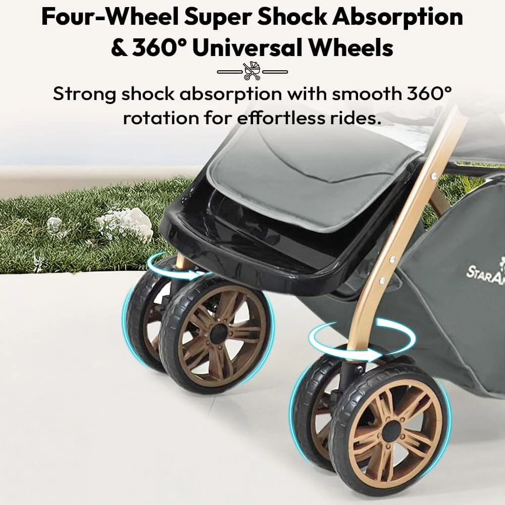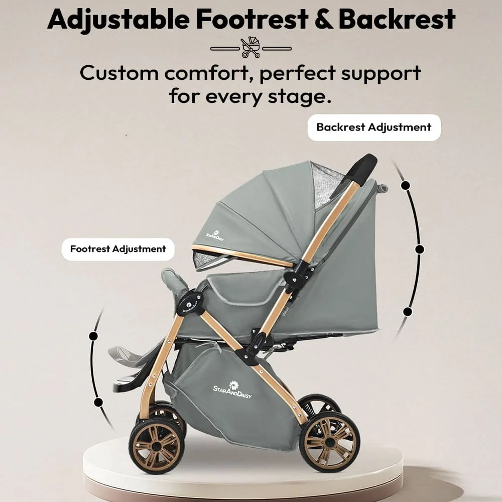 StarAndDaisy Daisy Trot Baby Stroller, Lightweight, Foldable, Multi-Position Recline with Safety Belt & Shock Absorption – Grey