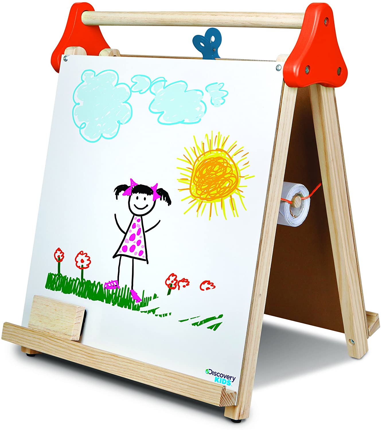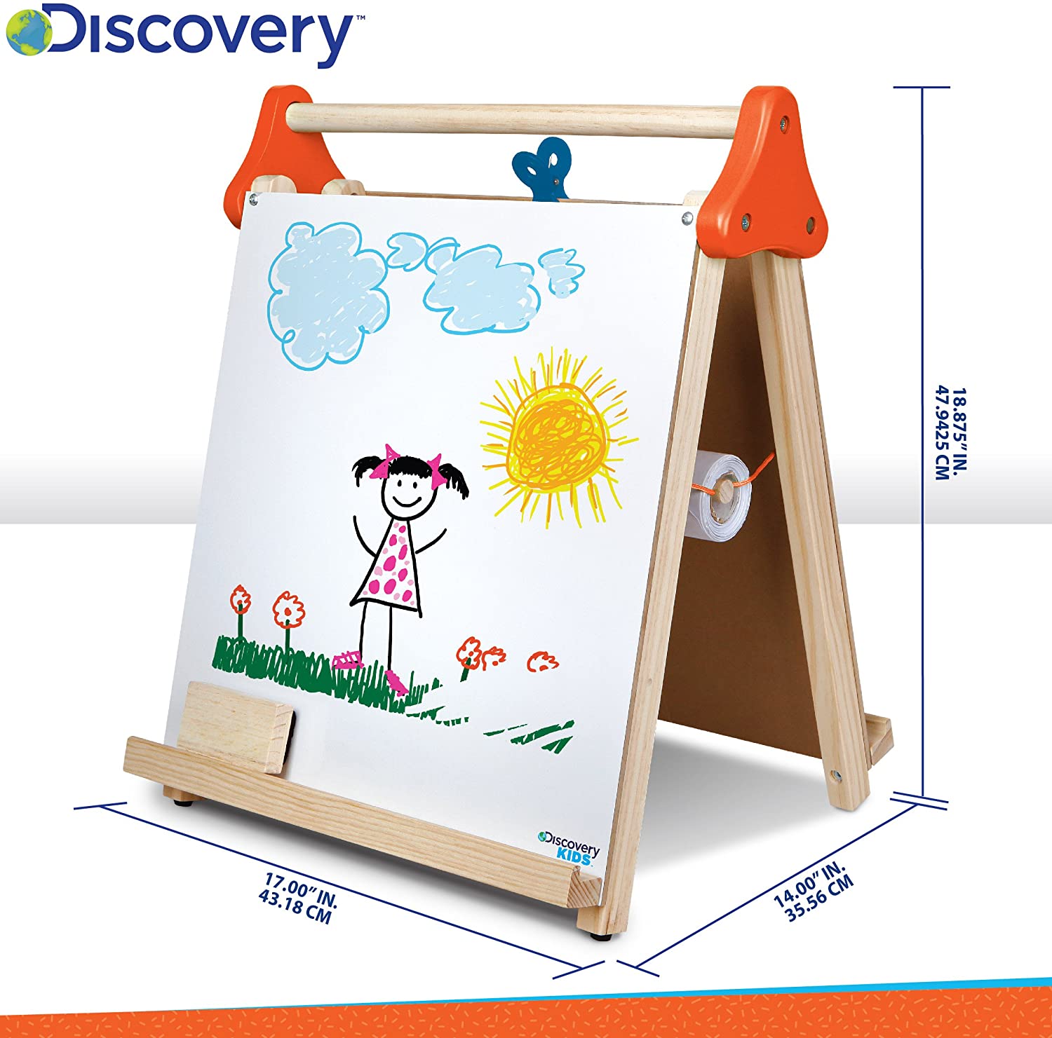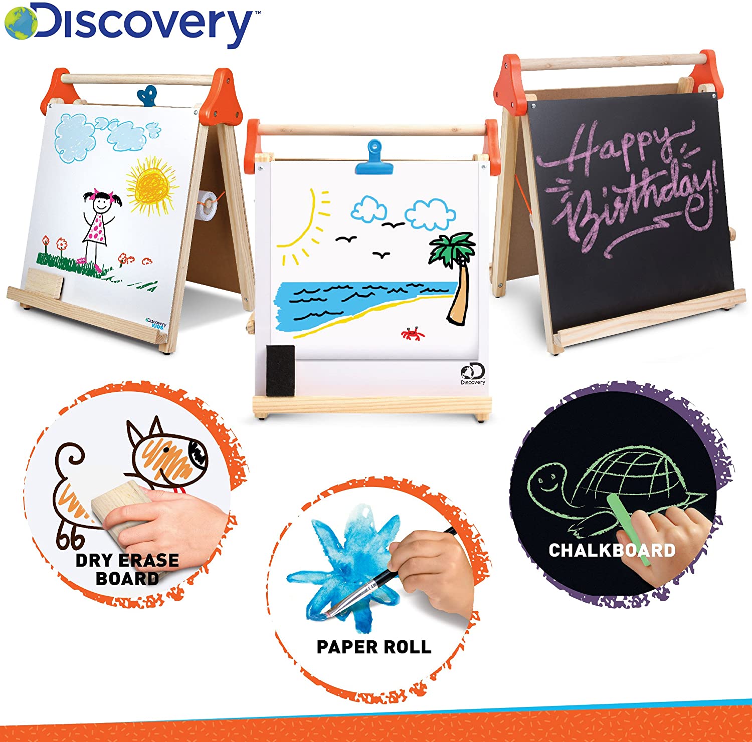 Got an aspiring Picasso or Frida Kahlo in your life? Develop your child’s love of the arts with the DISCOVERY KIDS 3-in-1 Tabletop Dry Erase, Chalkboard, and Painting Easel! Crafted with a dry-erase board on one side and a black chalkboard on the other side, this multifunctional easel is also designed with a built-in paper roll holder, so kids can create whatever they want, wherever they want. Take Their Masterpieces Anywhere, Anytime. This lightweight, foldable easel is crafted from high-quality solid wood for sturdiness and is portable to be set up on any countertop or table surface. When finished, the easel folds for easy storage. A simple flipchart display allows preschool teachers to present drawings, diagrams, and simple equations to eager learners. The easel is also a welcome addition for group art activities in the classroom since the double-sided construction allows students to form intrapersonal connections in an engaging setting.