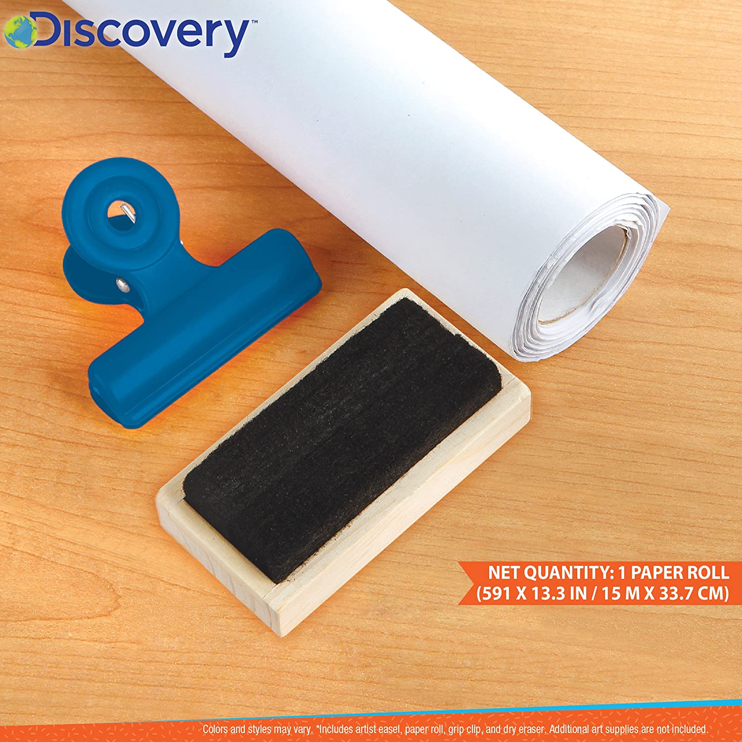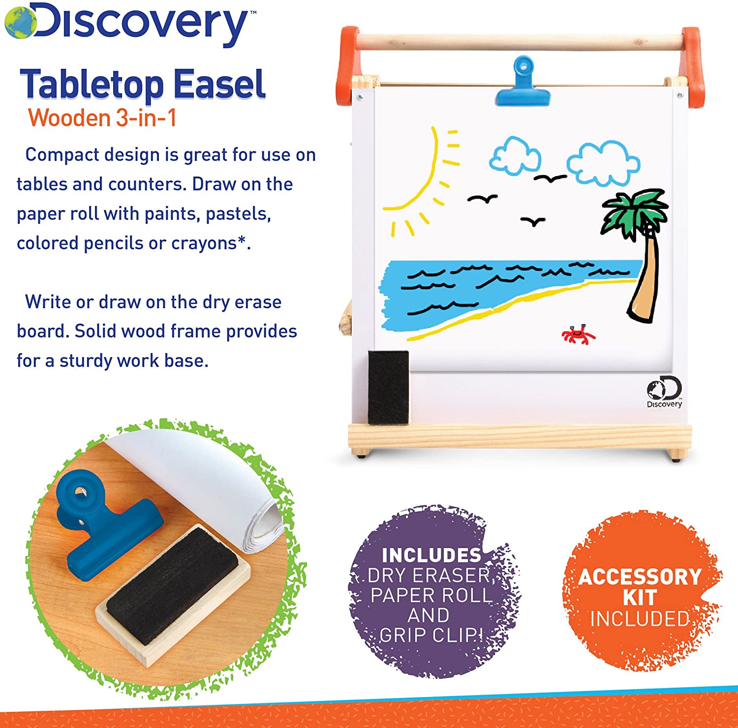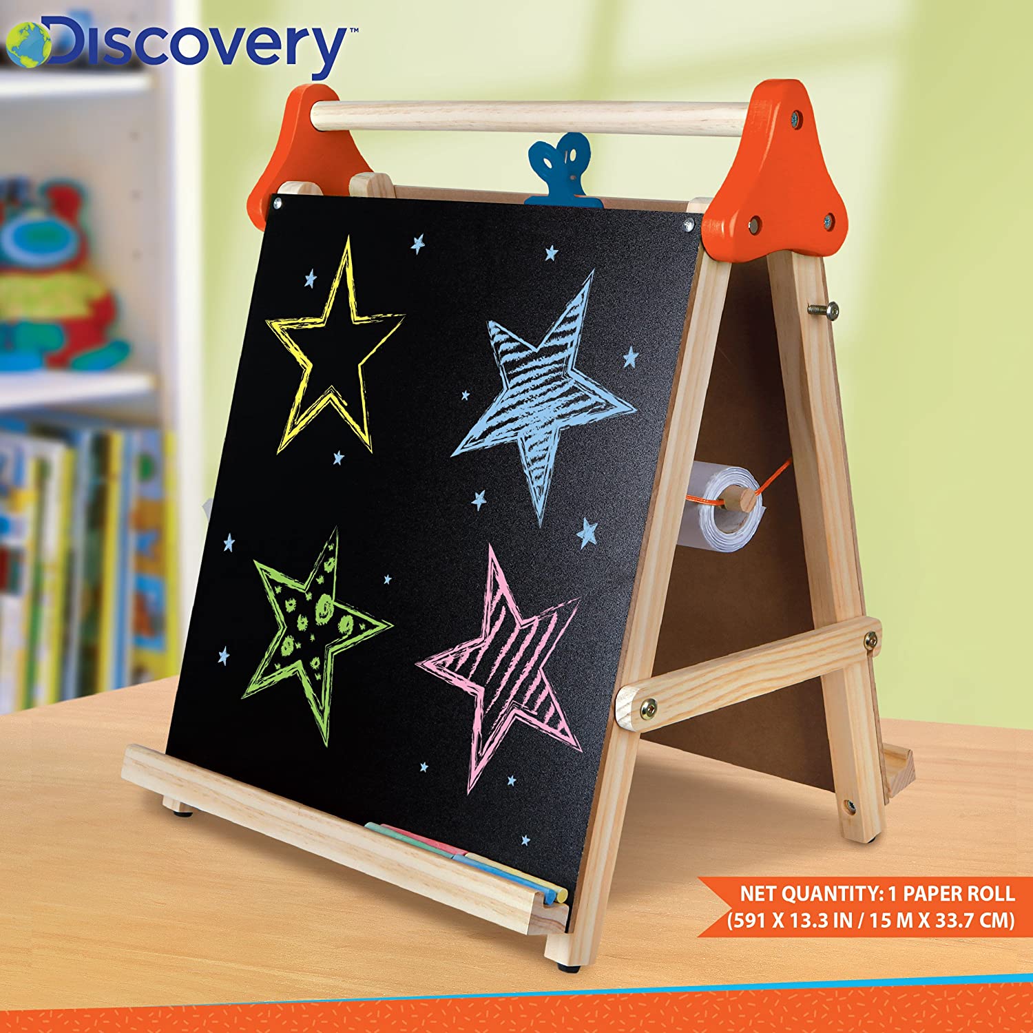 Got an aspiring Picasso or Frida Kahlo in your life? Develop your child’s love of the arts with the DISCOVERY KIDS 3-in-1 Tabletop Dry Erase, Chalkboard, and Painting Easel! Crafted with a dry-erase board on one side and a black chalkboard on the other side, this multifunctional easel is also designed with a built-in paper roll holder, so kids can create whatever they want, wherever they want. Take Their Masterpieces Anywhere, Anytime. This lightweight, foldable easel is crafted from high-quality solid wood for sturdiness and is portable to be set up on any countertop or table surface. When finished, the easel folds for easy storage. A simple flipchart display allows preschool teachers to present drawings, diagrams, and simple equations to eager learners. The easel is also a welcome addition for group art activities in the classroom since the double-sided construction allows students to form intrapersonal connections in an engaging setting.