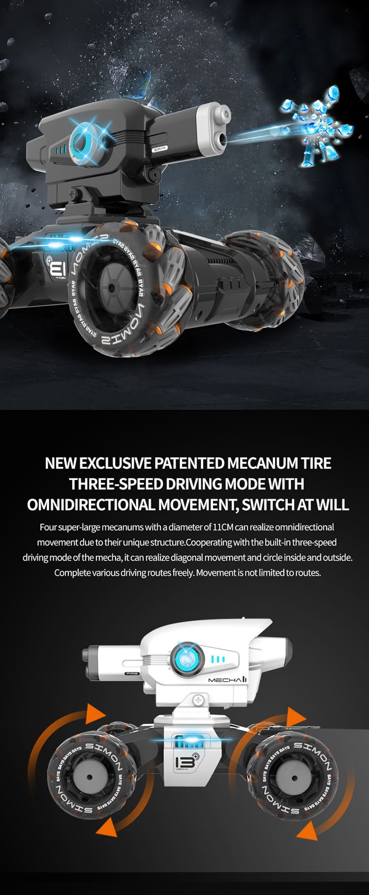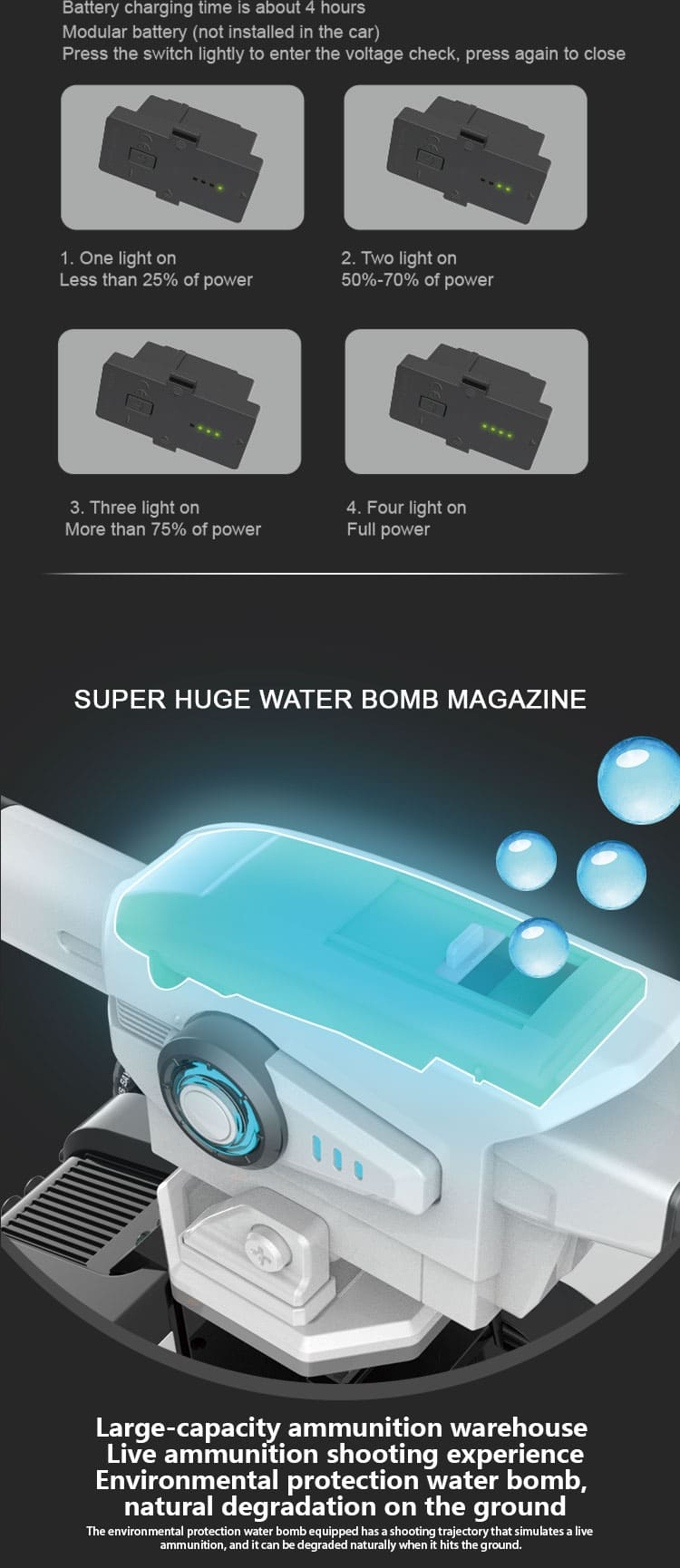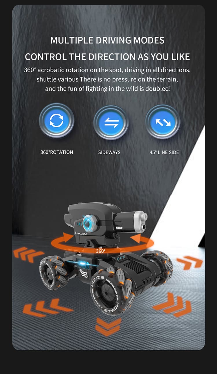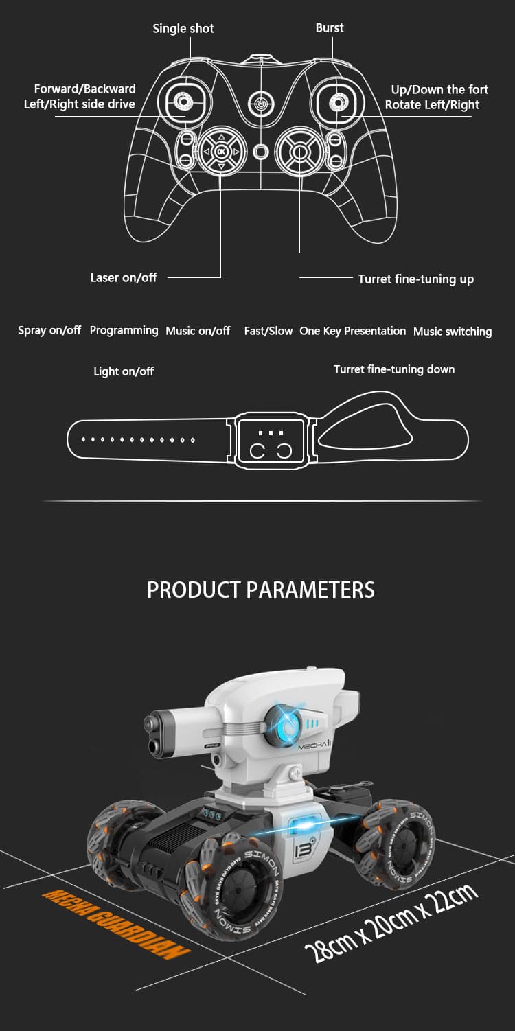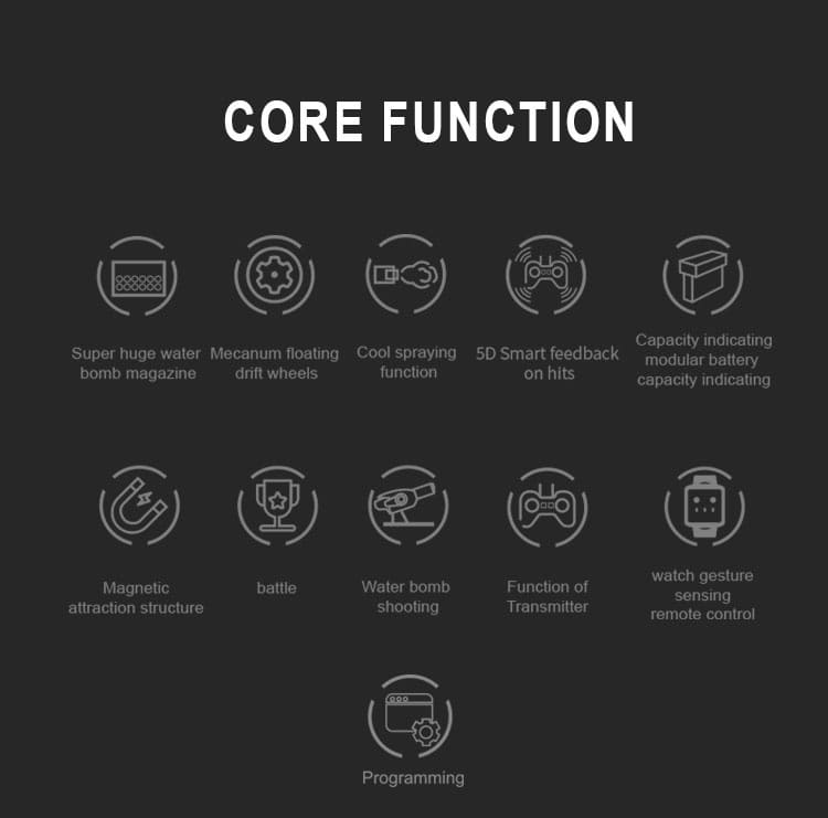 PRODUCT FUNCTION – Forward, Backward, Turn left. Turn right, Rotate. Light, Music, Water Bomb Shooting Spray, Programming, Dual Remote Control, Modular battery, Super Large Number of Magazines, Magnetic pole structure, New patented mecum wheel, Infrared laser