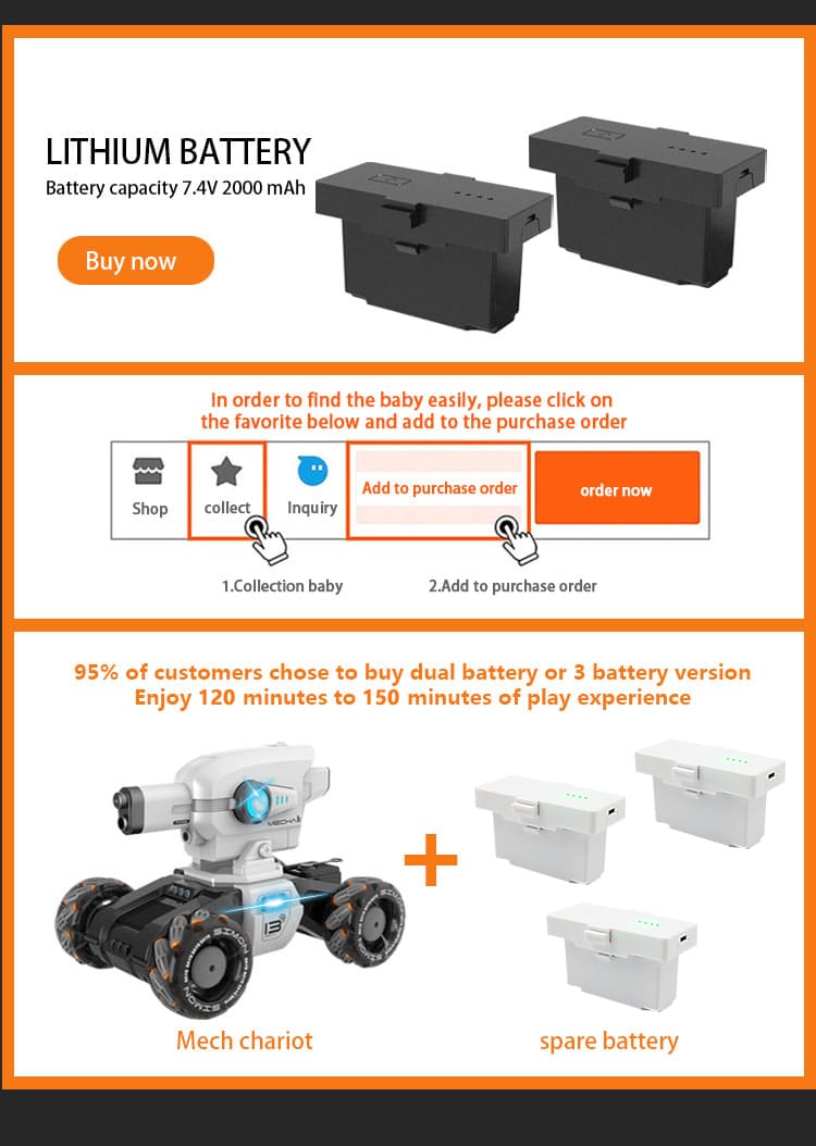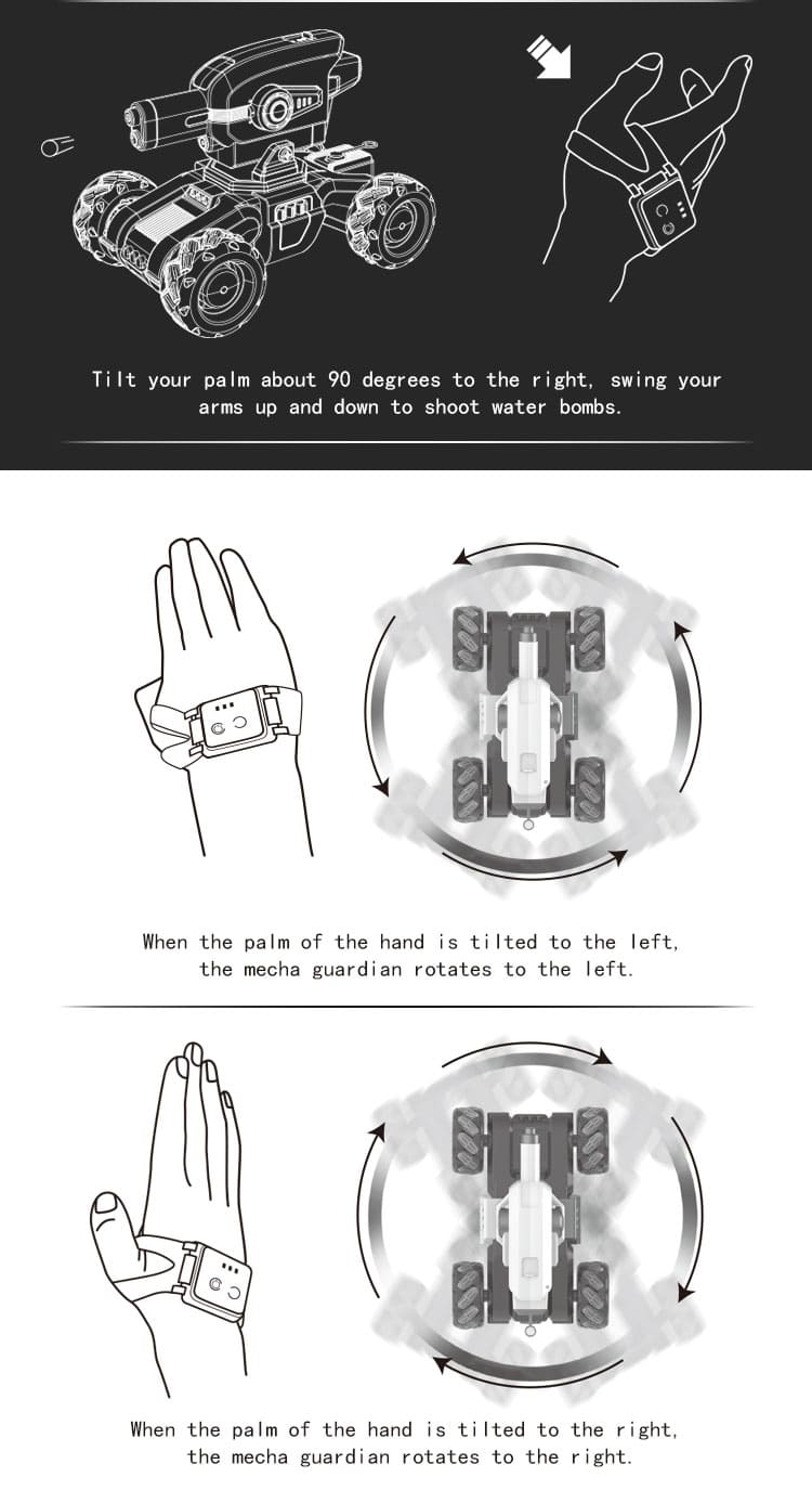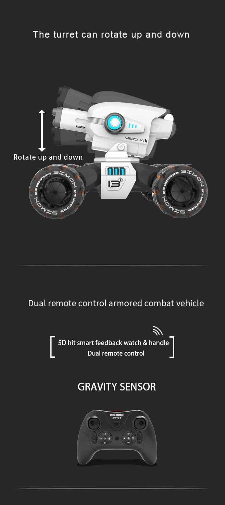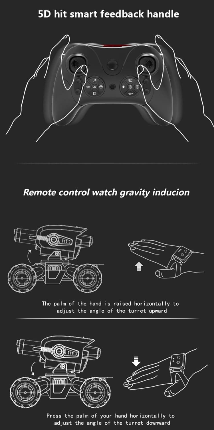 PRODUCT FUNCTION – Forward, Backward, Turn left. Turn right, Rotate. Light, Music, Water Bomb Shooting Spray, Programming, Dual Remote Control, Modular battery, Super Large Number of Magazines, Magnetic pole structure, New patented mecum wheel, Infrared laser
