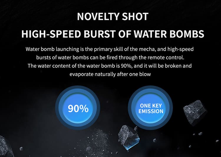 HIGH-SPEED BURST OF WATER BOMBS – Water bomb launching is the primary skill of the Macha, and high-speed bursts of water bombs can be fired through the remote control. The water content of the water bomb is 90%, and it will be broken and evaporate naturally after one blow.