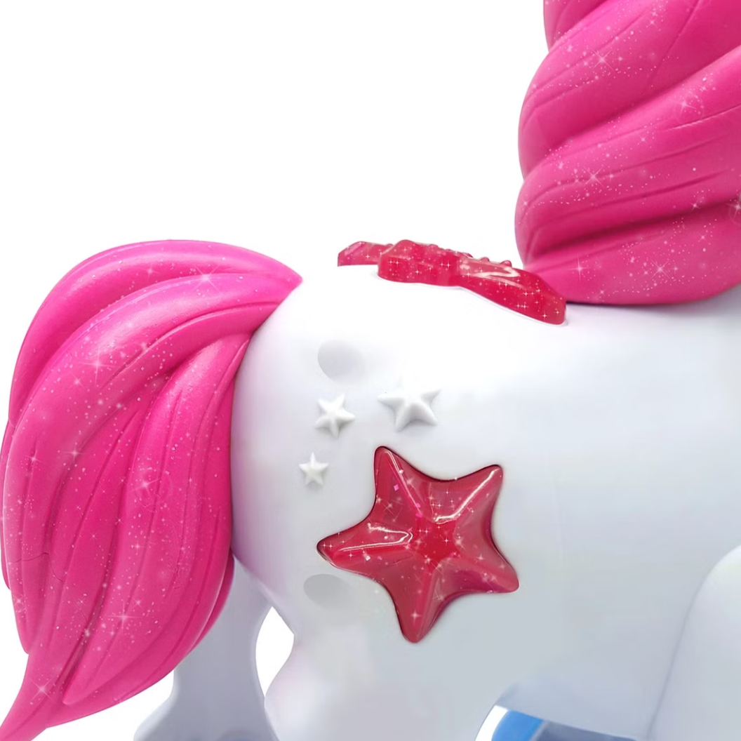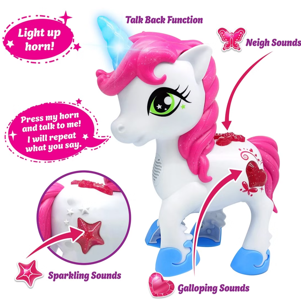 Have hours of fun with this Touch & Talk Little Unicorn .Features a talk back function, neighing, galloping and sparkling sounds. .Perfect for kids who adore unicorns.