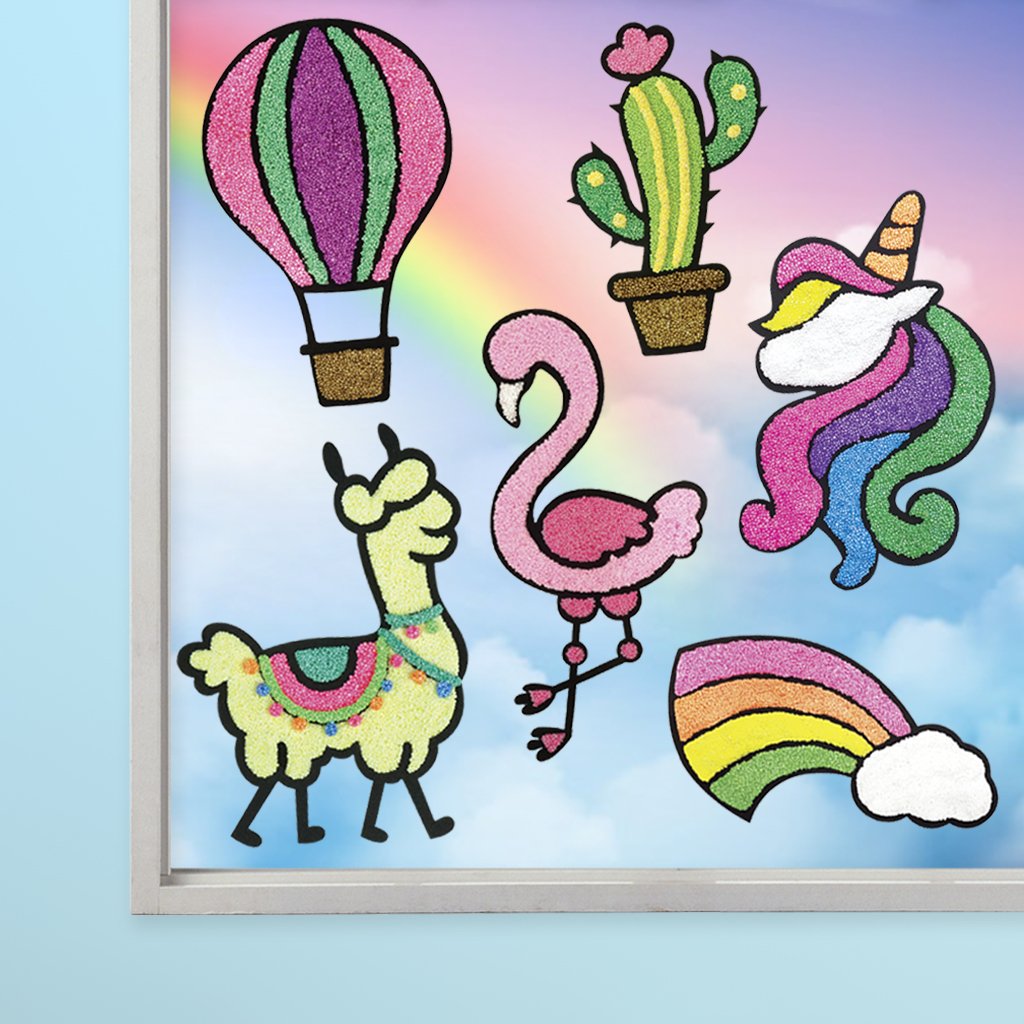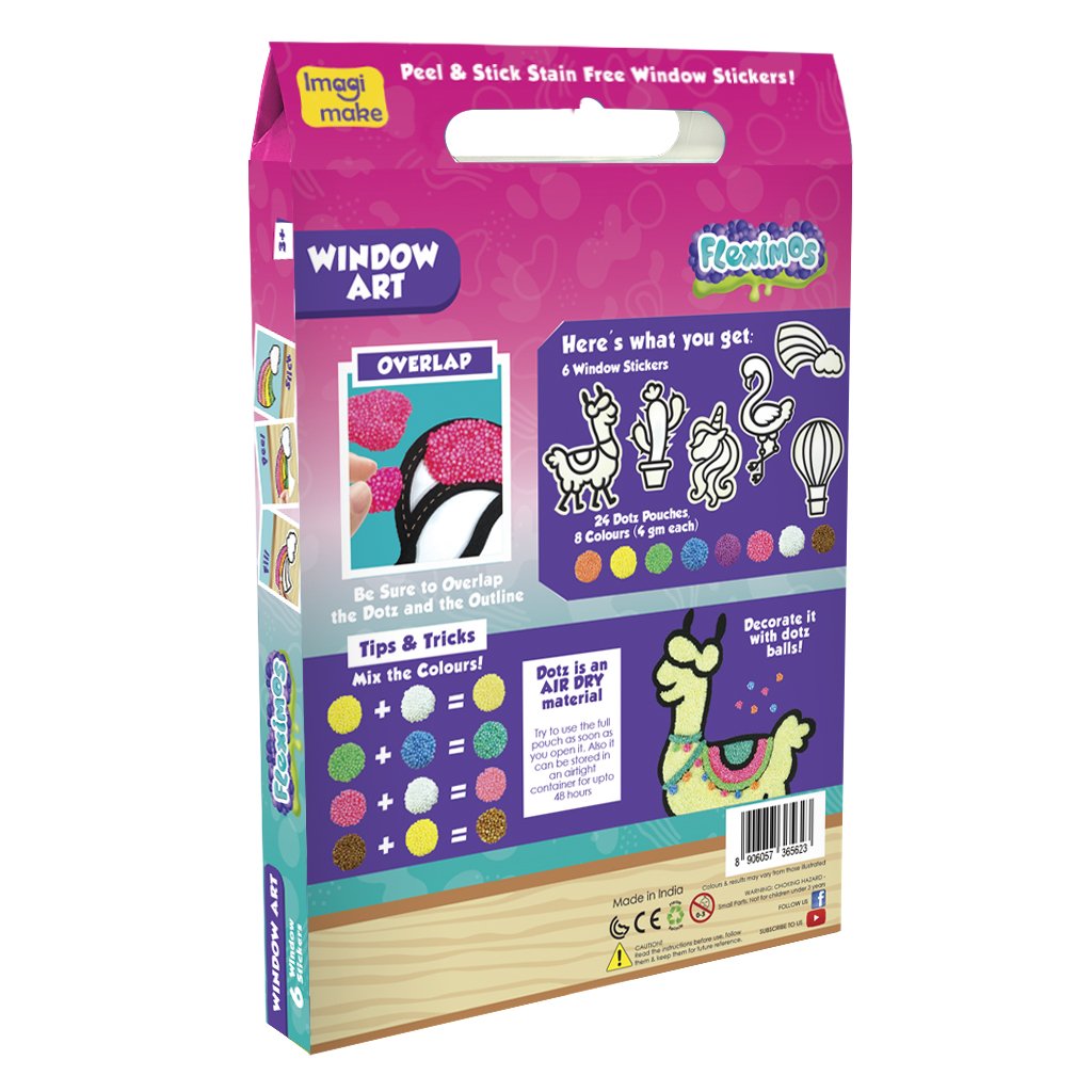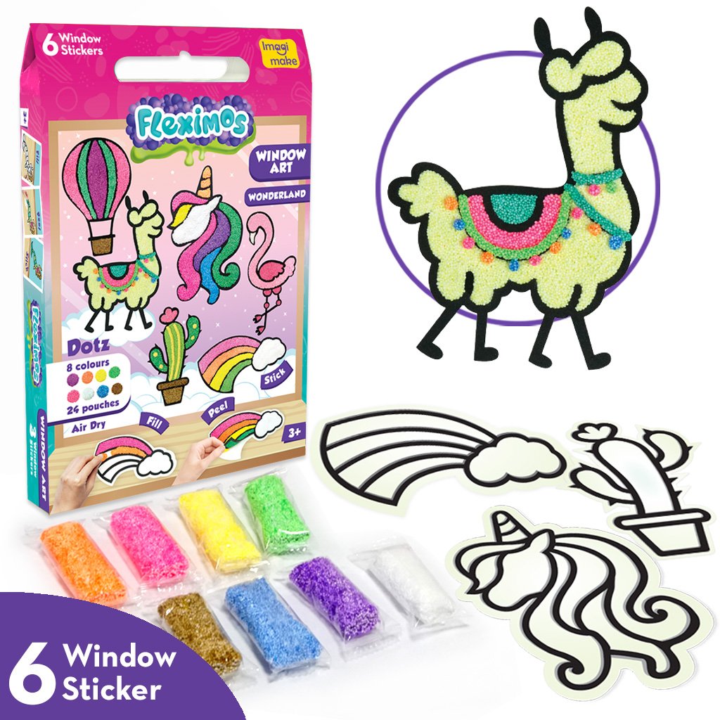 CREATIVE FUN WITH FLEXIMOS – Let your child experience the joy of creativity by decorating their room with these Charming Wonderland DIY Window Art stickers 6 APPEALING DESIGNS Includes 6 window stickers Balloon, Unicorn, Llamas, Flamingo and More! Comes with 24 pouches of clay for kids in 8 colours QUICK & EASY CRAFTS It’s so easy, even a 3-year-old can enjoy it. Just fill in the special Dotz Clay in the lovely sticker outlines while making sure to use lots and lots of clay! STAIN-FREE STICKERS Once the stickers are made, just turn them upside down and gently peel off the silicon paper. Just stick it on any smooth surface. We love using them on windows, mirrors, tiles and even desks & wardrobes. Once you are ready to change the look of your room, you can simply peel off the sticker and place a new one! PERFECT GIFT Wonderland Window Art is a great indoor activity for the kids. It is a great option for party gifts or return gifts as well. CONVENIENT PACK SIZE Dotz is an AIR DRY material. We have packed it in small pouches to help you consume a whole pouch once you open it. In case you wish to save an opened pouch, be sure to pack it in an air tight container (it can last for 48 hours) KID SAFE CRAFTSThe kit features non-toxic and child-friendly materials