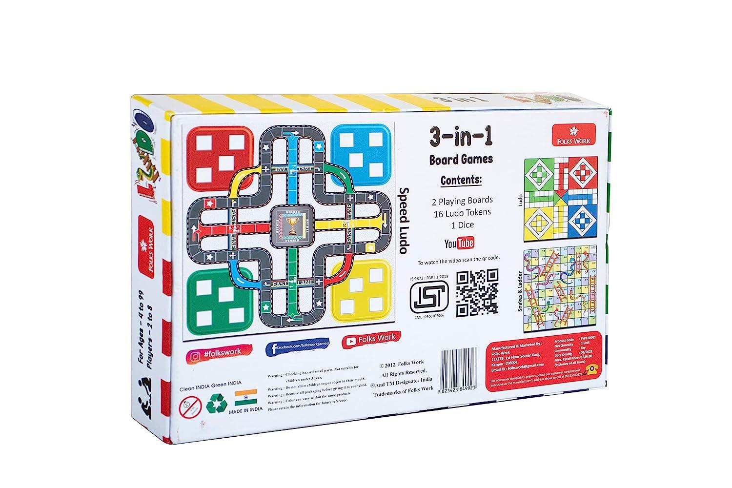 Folks Work Ludo 3in1 Board Game – Best Games for All Ages,Three Exciting Games in One Package, Traditional Ludo, Snakes and Ladders, Players 2 to 8