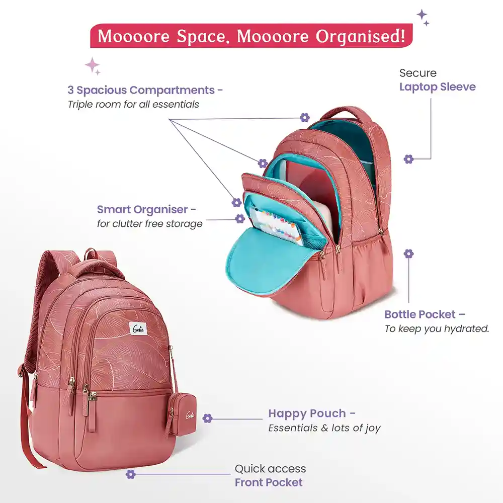 Advance your daily commute with the best Laptop Backpack for Work! Created to stay organized, this stylish and practical backpack is ideal for working professionals and students. From a hectic day at the office, a spontaneous coffee meeting or a weekend study session, this backpack has got you covered. It has a padded laptop sleeve to safeguard your device, three roomy compartments to carry files, gadgets, and other crucial items, and a front pocket for immediate access to such things. The inbuilt organizer is available to keep tiny things in order and at easy reach, with the side pockets providing easy storage for water bottles or other immediate-access items. In addition, the adorable and practical Happy Pouch is ideal for storing small essentials such as keys, cards, and coins. Durable and of high quality, this laptop backpack is ready to take on all your work and travel escapades!