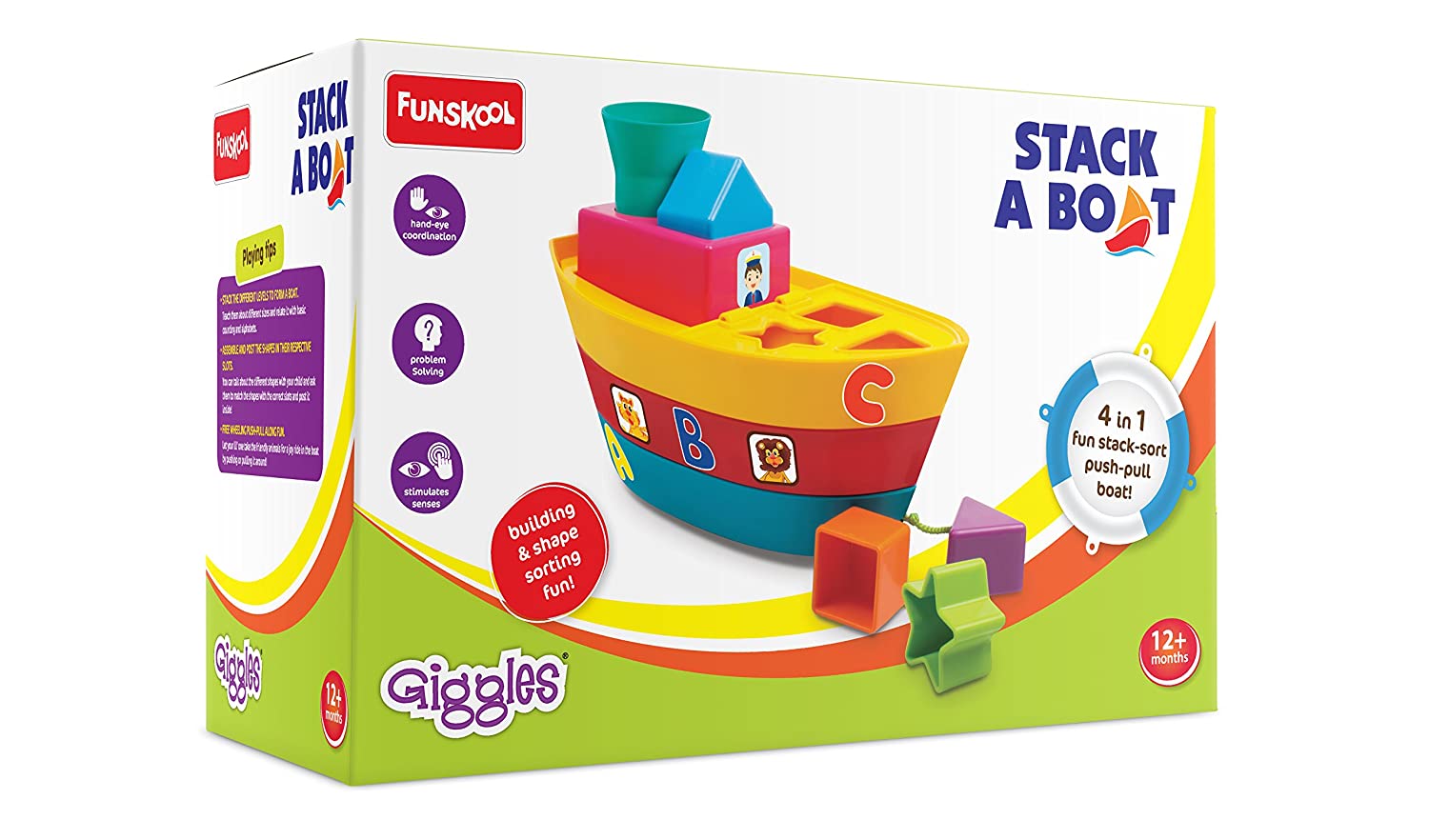 Has your champ recently started taking interest in colours and shapes? Then this Funskool stack a boat is a very good option which will keep him entertained as well as develop his cognitive skills. Funskool, one of the leading toy manufacturers, has come up with this set of stack a boat contains 3 boat bases of different sizes and colours. The top base has 3 different shapes to sort and it has 3 different shapes to assemble too. They are made of child safe durable plastic and have no sharp edges. It is ideal for kids over 12 months of age. Benefits of stack a boat. Develops hand eye coordination when the child tries to stack one on top of the other then it automatically helps in developing the hand eye coordination. Helps in identifying colours. The bright colours of the cubes help your child to identify the basic colours like red, blue, green and yellow. Since the shapes are different, the kid has to identify the correct shape to fit into the boat, which help to improve their observation power. Keeps the kid occupied. In the process of stacking the boat and push n pull option, your child will remain occupied for a certain period of time. So get your little one this interesting game and helps him develop his overall motor skills.