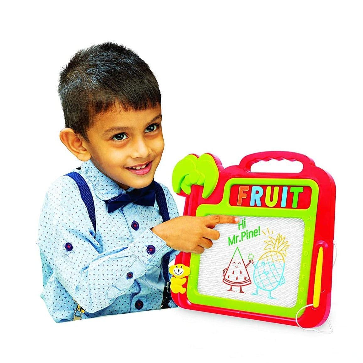 The magnetic drawing board has a panel for alphabet and number placement, making it a fun and educational tool. The stylus pen comes in four colors and the monkey slide eraser makes starting fresh easy. The thick and sturdy drawing board has a round handle for easy carrying and is a perfect space for kids to explore their creativity at home or on-the-go.