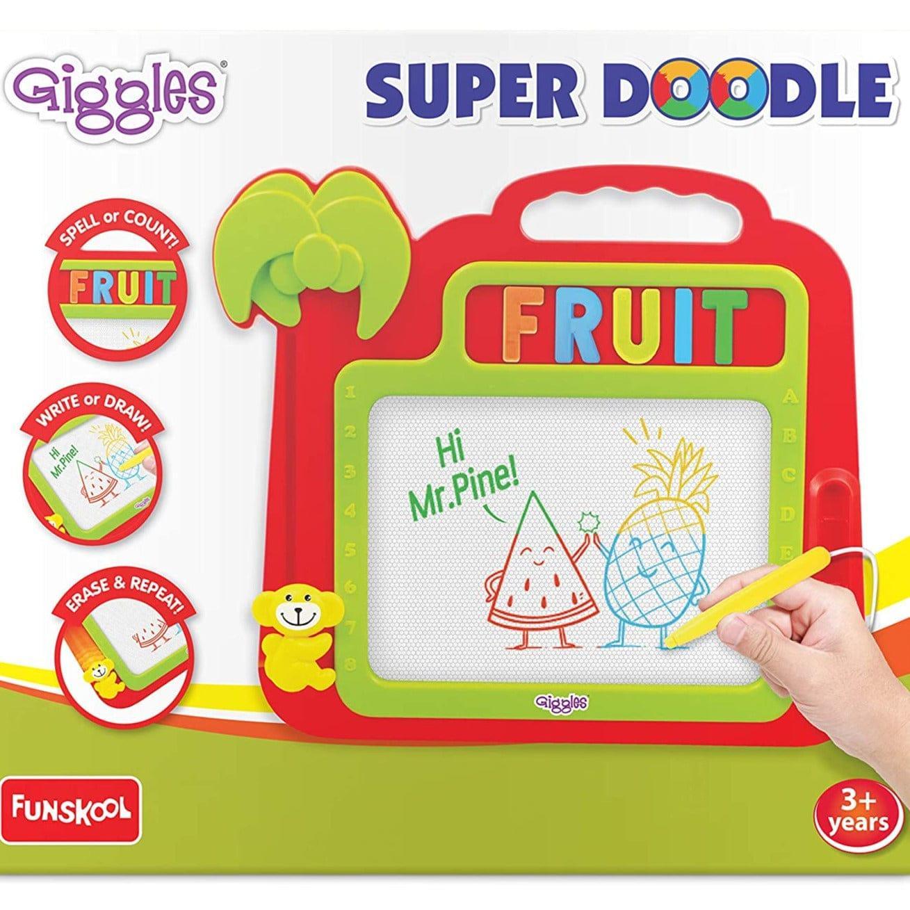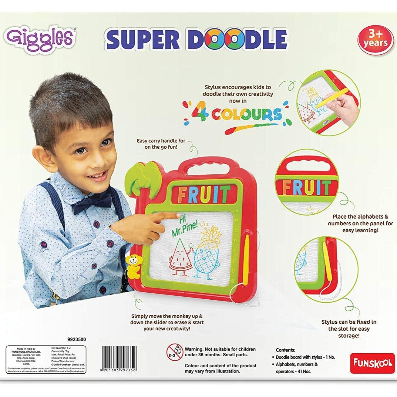 Kids can express their creativity for hours with the Giggles Super Doodle drawing board. This portable and mess-free board allows them to erase their creations by moving the slider up and down, giving them a blank canvas to start anew. Using the pen and practicing pre-writing skills also gives their fine motor skills a workout.