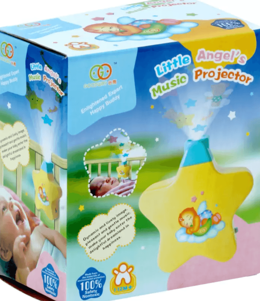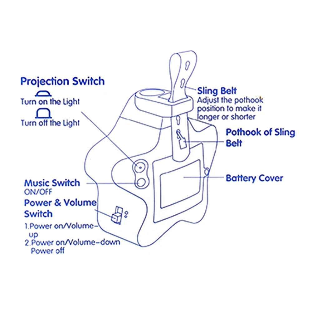 The Goodway Little Angel Music Projector is the perfect way to help your baby drift off to sleep. With dynamic and lively images, and gentle music, your baby will enter a delightful dream land with ease. The projector has light turn on and off buttons, and can be used just to play smoothening music. The length of the sling belt is adjustable at the pothook position, and there are power on/off and volume control buttons. The projector is made of high quality and 100% non-toxic plastic with no sharp edges. See the package for installation and battery usage instructions.