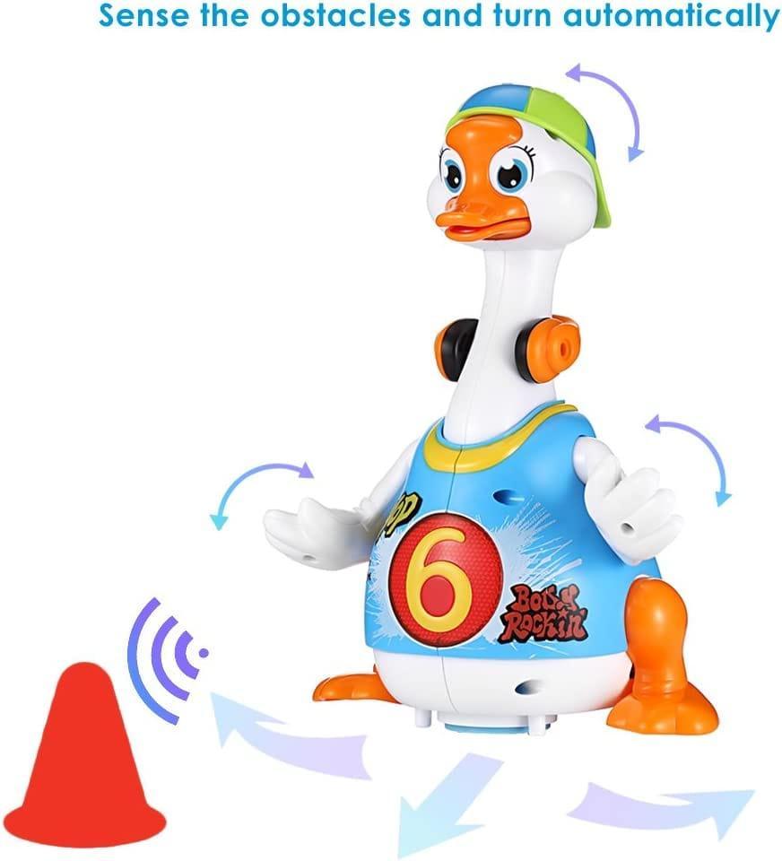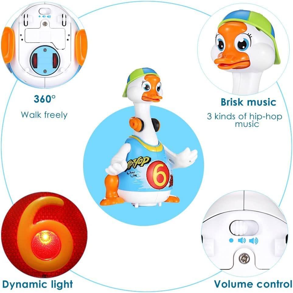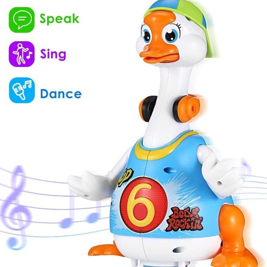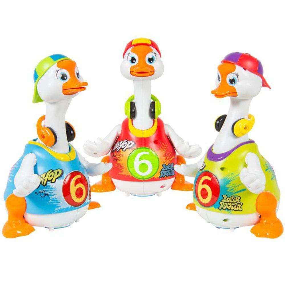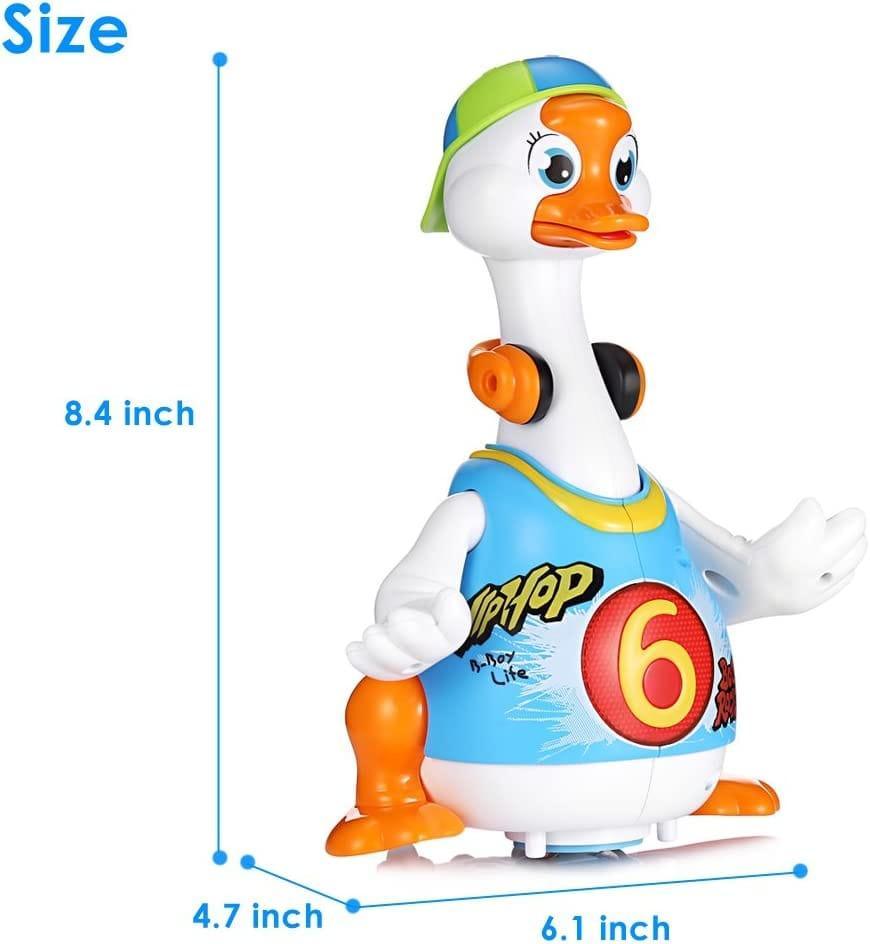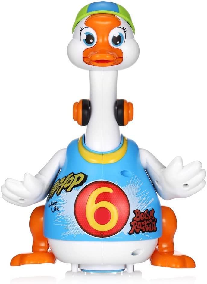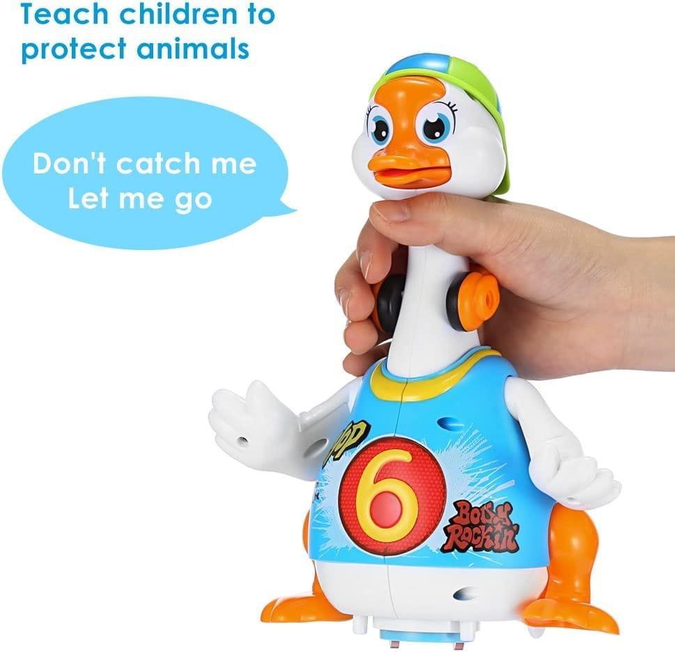 The Hola Swing Goose is a battery powered smart dancing goose, designed for toddlers to develop their body movement and motor skills in a very fun way. Stimulate babies body movement and muscle development when imitating goose dance. This humorous, vivid, and funny goose will struggle and yell when caught by neck. It will dance swing its head and tail hip hop style. Pick it up and hear it plead to be put back down. Catch the goose by its neck and it will struggle and scream.