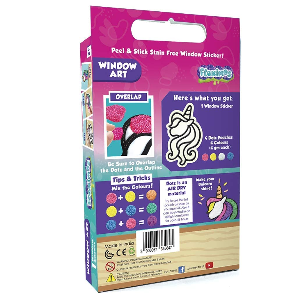 CREATIVE FUN WITH FLEXIMOS – Let your child experience the joy of creativity with this Unicorn DIY Window Art sticker APPEALING UNICORN DESIGN Includes an Playful Unicorn sticker. Comes with 4 pouches of clay for kids in 4 colours QUICK & EASY CRAFTS Its so easy, even a 3 year old can enjoy it. Just fill in the special Dotz Clay in the lovely sticker outlines while making sure to use lots and lots of clay! STAIN FREE STICKERS Once the sticker is made, just turn it upside down and gently peel off the silicon paper. Just stick on any smooth surface. We love using them on windows, mirrors, tiles and even desks & wardrobes. Once youre ready to change the look of your room, you can simply peel off the sticker and place a new one! PERFECT GIFT Unicorn Window Art is a great indoor activity for the kids. It is a great option for party gifts or return gifts as well. CONVENIENT PACK SIZE Dotz is an AIR DRY material. We have packed it in small pouches to help you consume a whole pouch once you open it. In case you wish to save an opened pouch, be sure to pack it in an air tight container (it can last for 48 hours) KID SAFE CRAFTS The kit features non-toxic and child-friendly materials