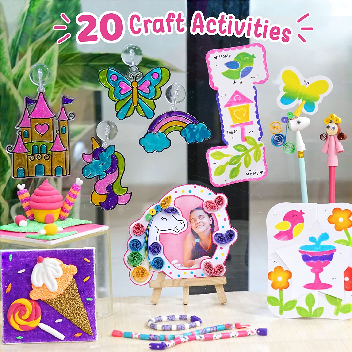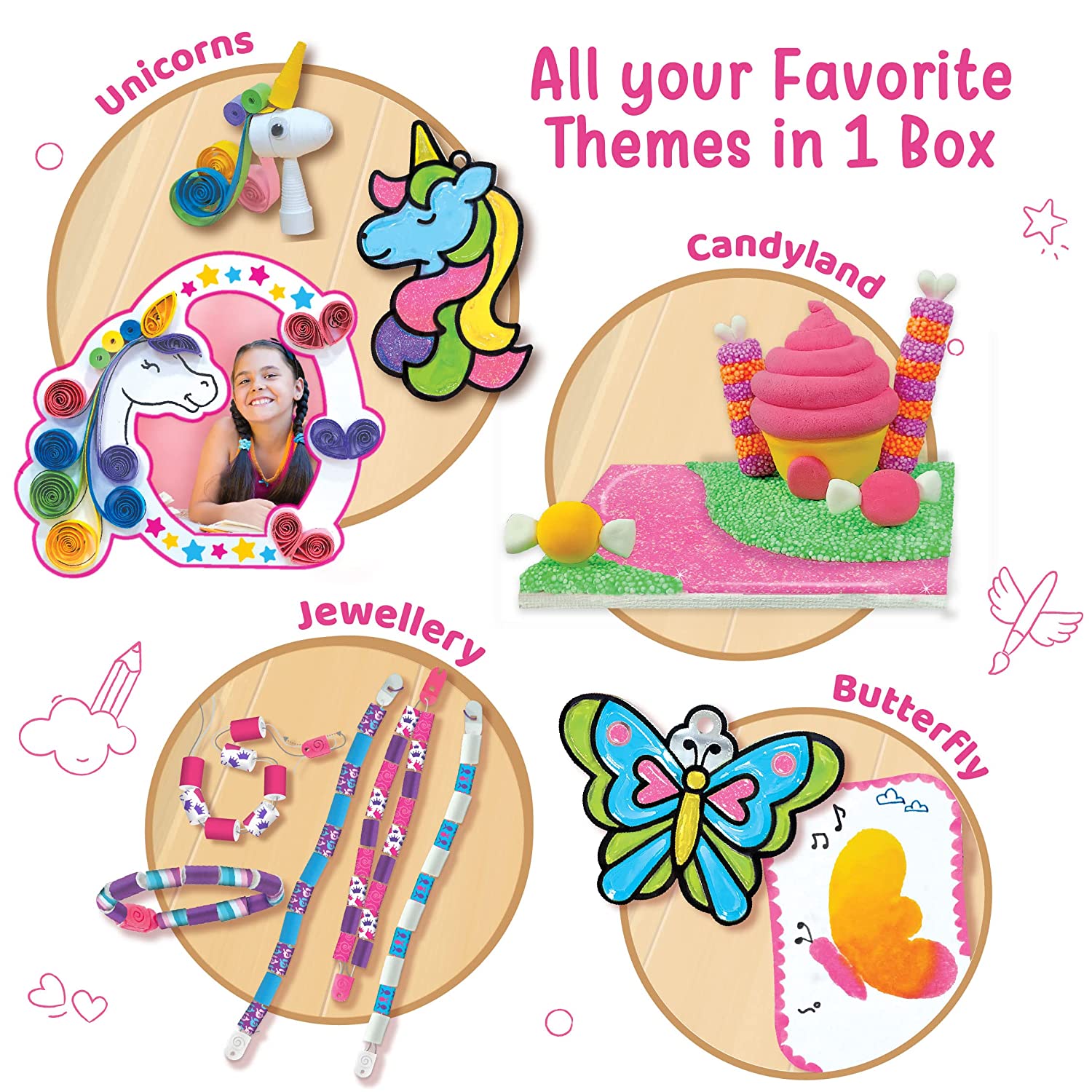 5-in-1 Awesome Craft Kit is a great art and craft set to explore the world of creativity which and has the best craft ideas for kids. From Model Making sets to 3D Paper Craft and Stamping and Colouring to Clay Activity- it has it all! This kit is a great way to introduce the child in the different craft forms from a very young age. It also helps in developing Creative Problem Solving Skills, Eye Hand Co-ordination and Motor Skills. The activities are packed in different sleek boxes which are easy to carry even while you are travelling. In 3D Miniatures Model, kids can create up to 4 Bird Models which are of EVA foam material. We provide 4 Creative Cards with Spyro Coiler (manual quilling tool) and 40 Sticky Back Strips for the kids to enjoy paper quilling. In Clay Window Stickers, we have Dotz clay (air dry clay) pouches which can be used to fill up the window stickers to decorate the room! Stamping is now much more fun with our Dual Tip Stamp Pens and 6 Stamps that are designed for easy blending. The 4 Creative Projects Template makes it more interesting and encourage the kids get started in stamping and then go on to create more and more. In 3D Paper Craft for kids – we include 3 Plastic Moulds and 30 Crinkle Sticky Back Strips to create 3D models of a Frog, a Fish and a Turtle – using strips of corrugated paper. Our products meet the highest standards of quality and safety. All the materials included in this kit are non toxic and safe for kids. Each of us loves to create! Our vivid imaginations provide an endless stream of awesome ideas. The contents of this box are a step in that direction. A great gifting option to encourage creativity in kids.