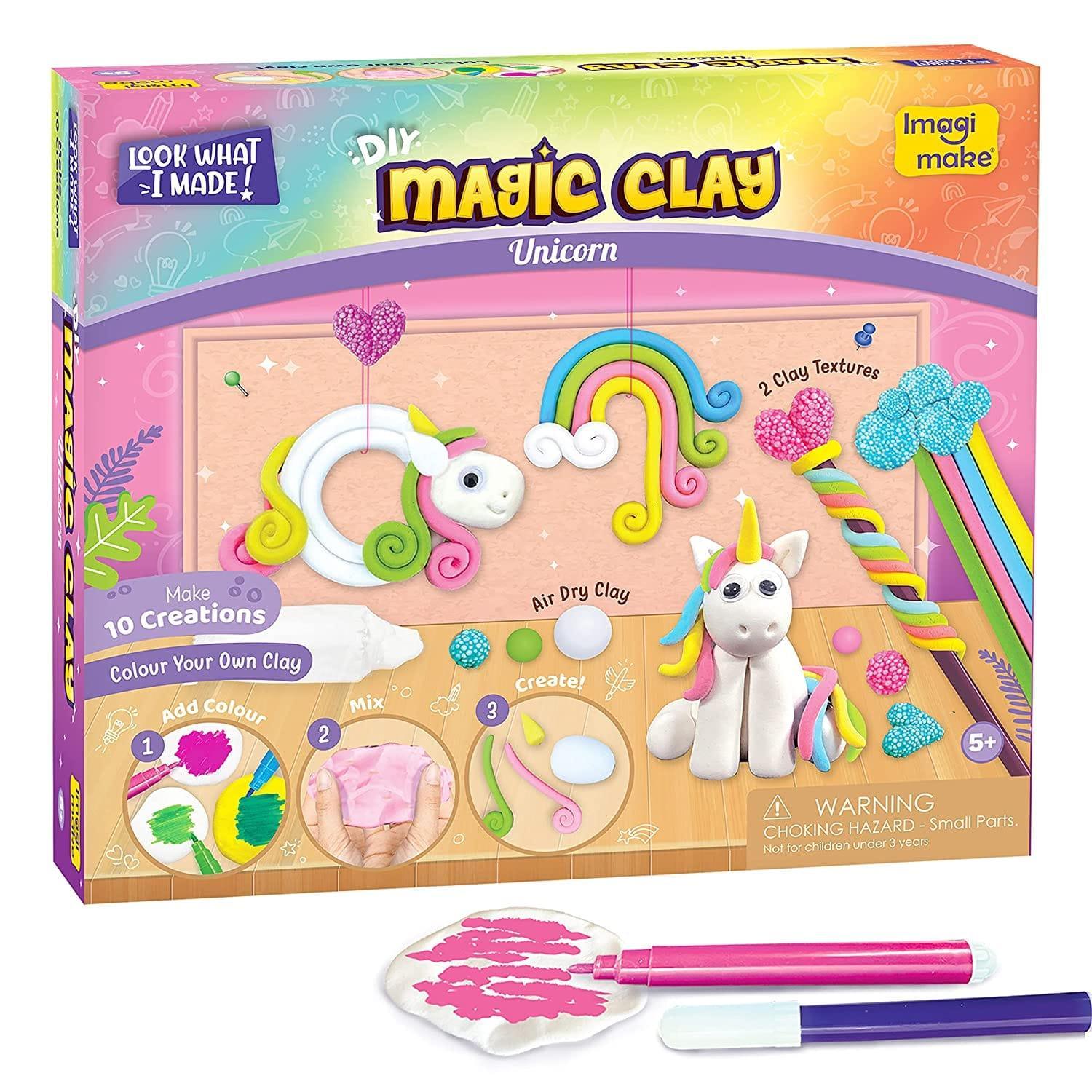 Let your child experience the joy of creativity with Imagimake Magic Clay Unicorn. This air dry clay modelling activity set promotes imaginative play and allows your child to add colours of their imagination to the clay. With this set, your child can make 10 beautiful creations like Unicorn in a Cloud, Rainbow Bookmark, Heart Pencil Topper, Donut Unicorn Hanging, Floating Unicorn and much more.
