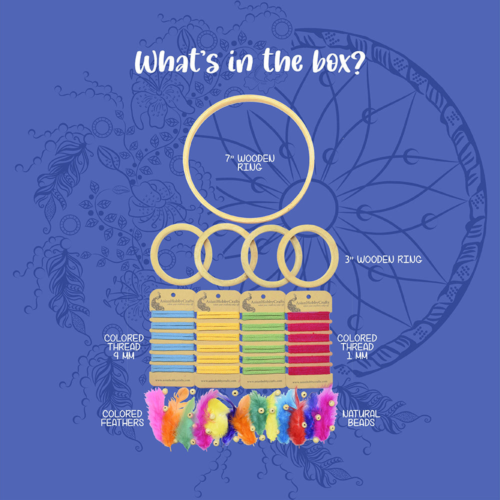 WHATS IN THE BOX?: 1 Wooden Ring (7Diameter), 4 Wooden Rings (3 Diameter), 4mm Colored Thread (Blue, Yellow & Green), 1mm Colored Thread (Red), multi-coloured Feathers, Natural Wooden Beads & a Well-Explained Instructions Manual.