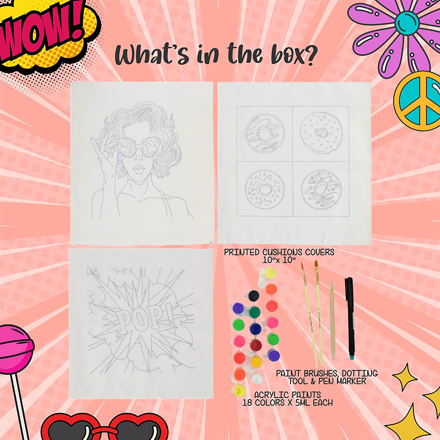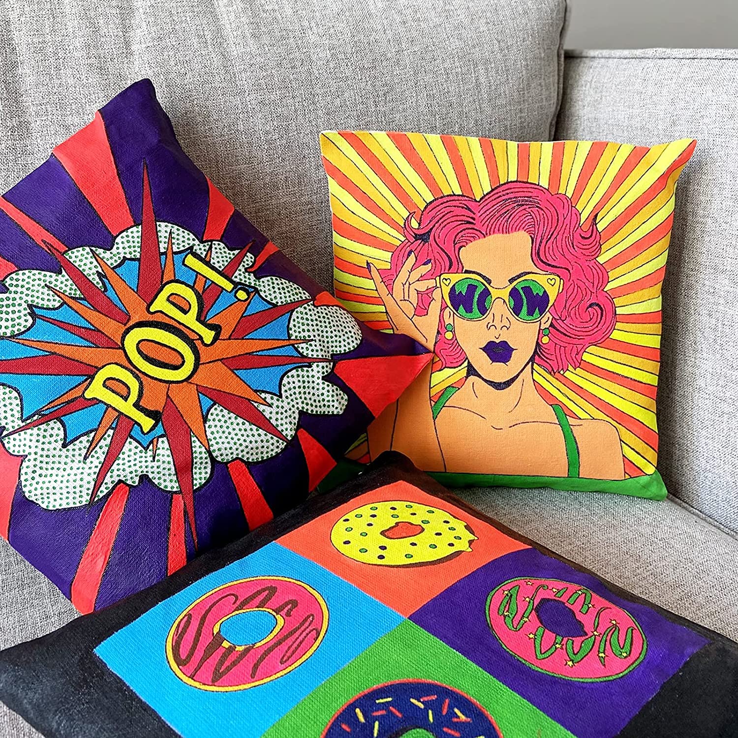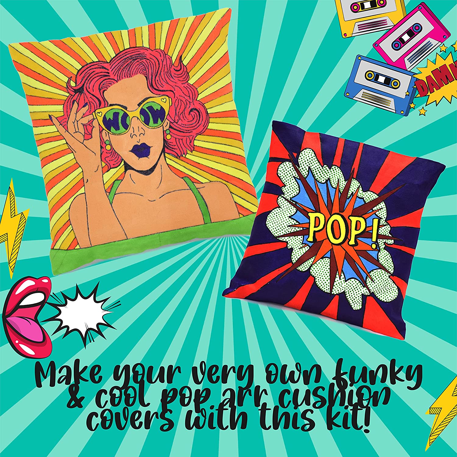 INCLUDES EVERYTHING YOU NEED – Our Paint Your Own Pop Art Cushion Cover kit has all the prerequisite materials inside to aid you in creating your very own vibrant pop art cushion covers. It contains 3 printed 10 x 10-inch cushion covers (designs as shown in images), 6 neon acrylic paints (10 ml each), 6 primary acrylic paints (5 ml each), and paint brushes. NOTE – This kit does not include inner cushions. EXPLORE – A leap from the traditional painting on canvases, try your hand at pop art painting with vibrant designs and a radiant colour palette. FUN TO DO – Splash around and play with neon paints; a whole new world of fluorescent magic awaits you!