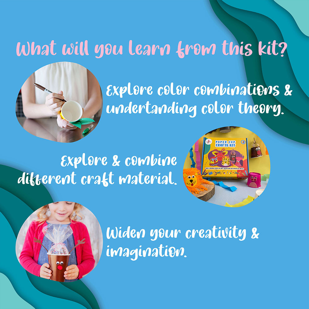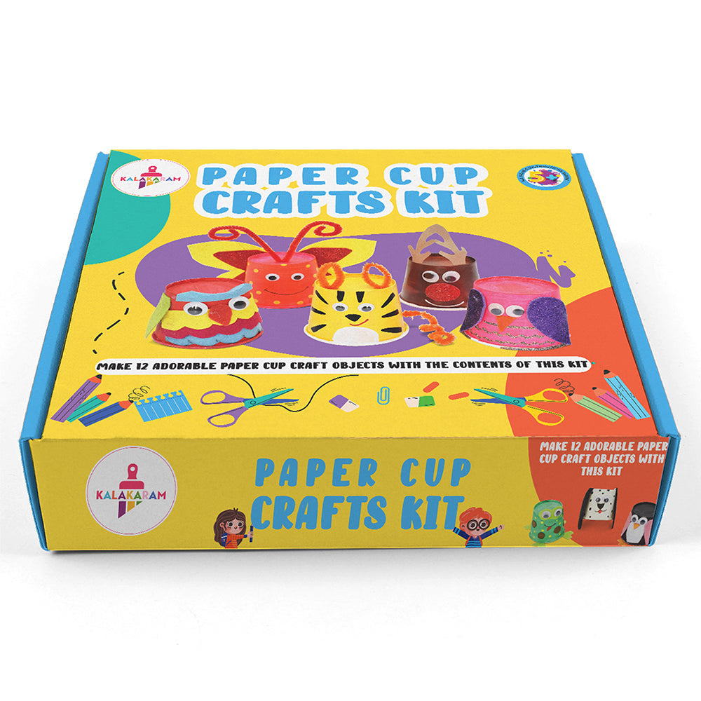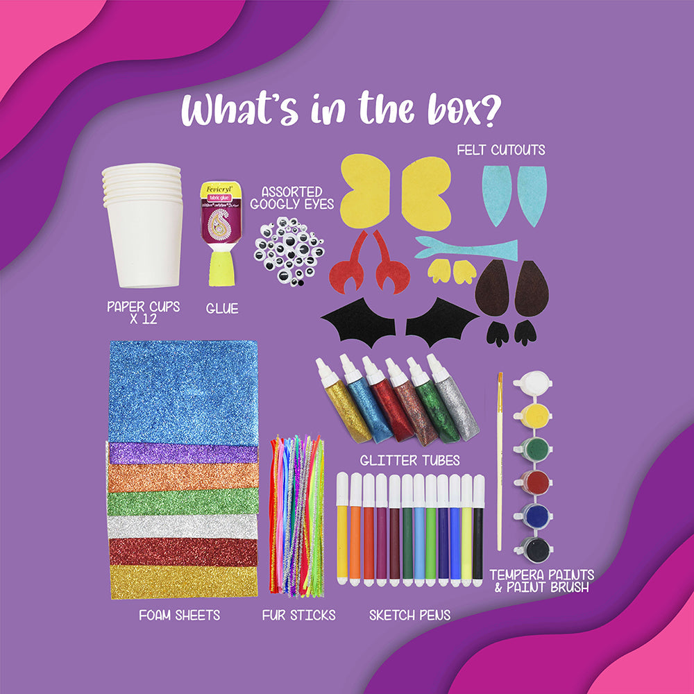 COMPLETE CONTENTS: This kit contains 12 Paper Cups, Assorted Glitter Foam Sheets, Colorful & Glittery Fur Sticks, 10 Colored Sketch Pens, 6 Glitter Glue Tubes, Assorted Googly Eyes, Felt Cut Outs, 1 Glue Tube, 6 Primary Colors Acrylic Paints & 1 Flat Paint Brush. ENCOURAGE PAINTING: Let your children discover their creative side! A whole new world of imagination, bold strokes and color awaits them! ART THERAPY: As a small tot, the touch and feel of a paintbrush, canvas, playing with colors for the first time, is a wholesome experience in itself; and is deeply essential for their holistic development. Not just kids, painting is proven to be a therapeutic activity for adults as well. FUN TO MAKE: This kit is a great activity to engage kids and encourage the artist within them. This fun activity is a perfect alternative to make the video game generation do something productive. DEVELOP SKILLS: The prime idea behind our DIY kits is to help develop very important skills in each kid along with a fun experience. This kit helps the child to increase FOCUS (by following each step with precision); encourage SELF EXPRESSION (by using the contents to create something unique), BOOST SELF ESTEEM by channelizing his/her energy into positive endeavors. GREAT FOR STORYTELLING: Paper cup animals/characters are a great medium to put life into your stories. With our Paper Cup Crafts kit, you can make any character of your choice and add life to your storytelling.