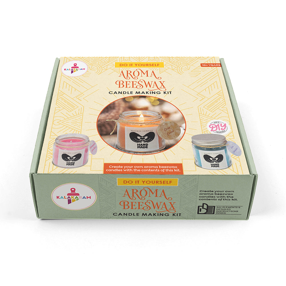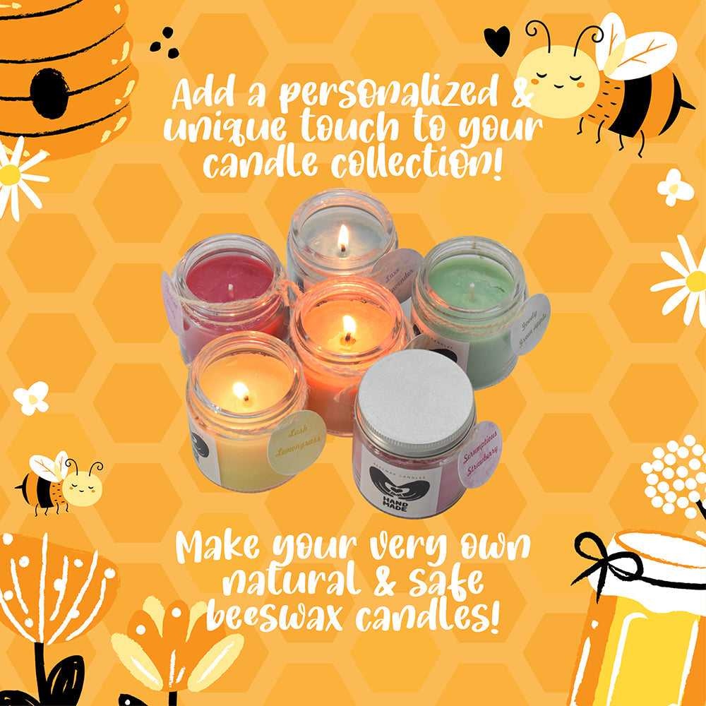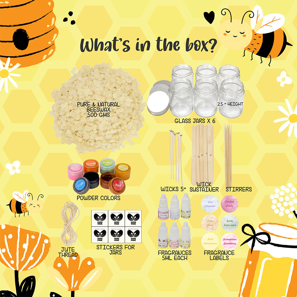 ALL MATERIAL INSIDE THE BOX: This kit includes all materials required to make 6 personalized Aroma Beeswax Jar Candles. It contains Pure & Natural Beeswax (500 gm), 6 Glass Jars (2.5 height), 6 Candle Wicks (5), 6 Fragrance Oils 5ml each (Lavender, Strawberry, Cocoa, Lemongrass, Green Apple & Candy), 6 Powder colours (Pink, Orange, Green, Yellow, Red & Blue), 6 Wick Sustainers, 6 Stirrers, 2m Jute Thread, 6 Jar Stickers, 6 Fragrance Tags & a Well-Detailed Instructions Manual.