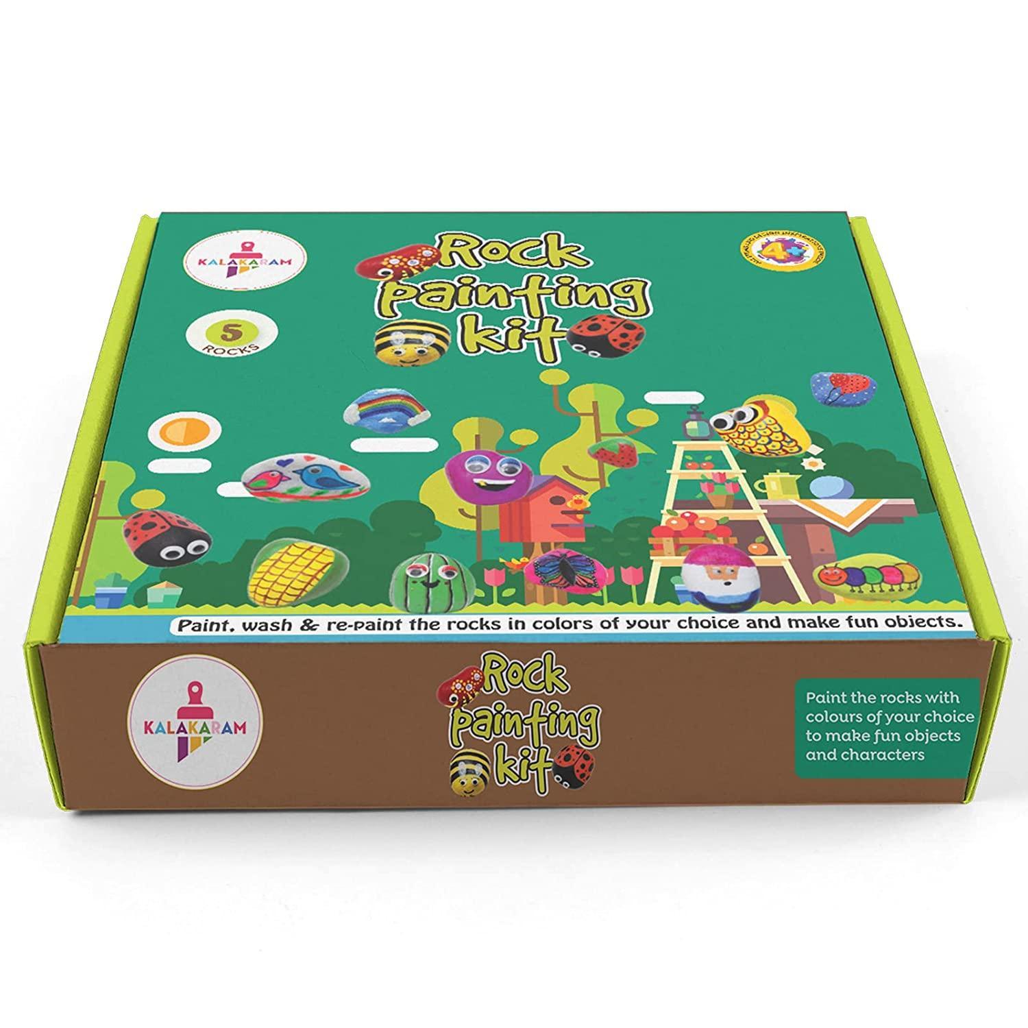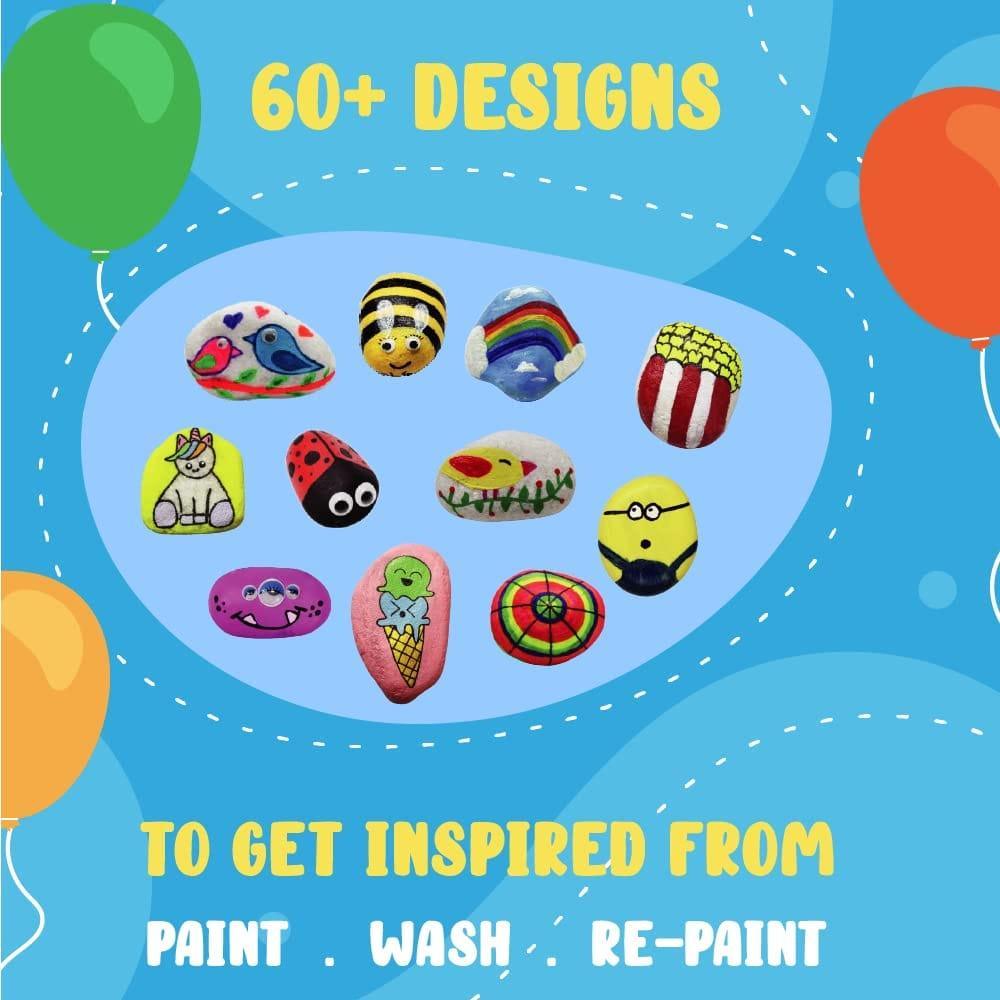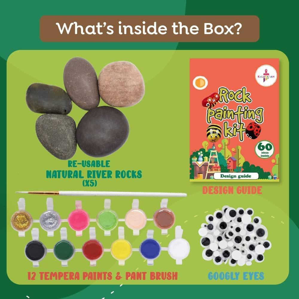 This Kalakaram Rock Painting Kit contains all the required material to make wonderful pieces of rock art. It includes 5 re-paintable river rocks, Googly Eyes, 12 tempera paints (6ml each), 60+ designs reference catalog, Paint Brushes.