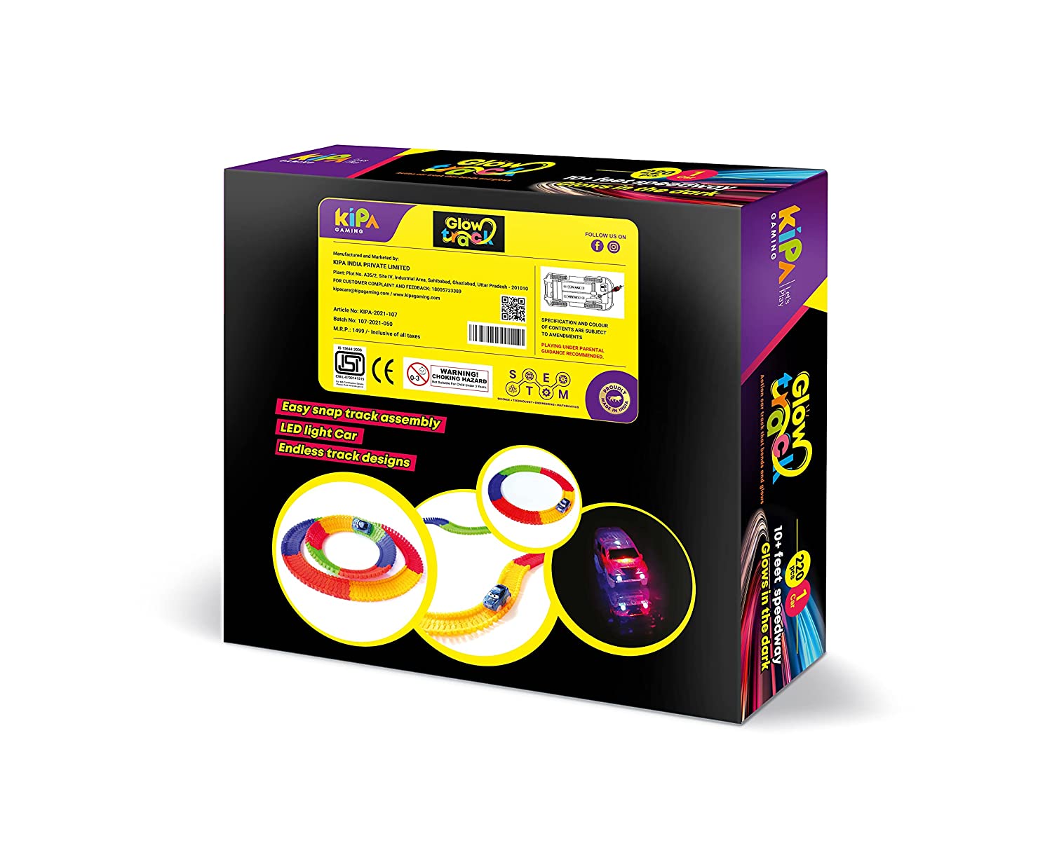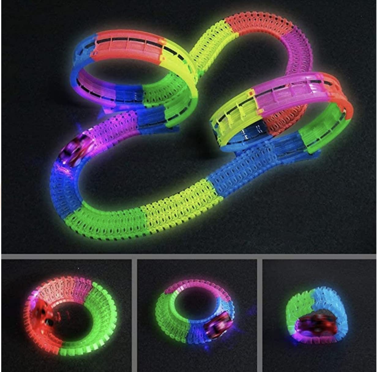 Introducing Magic Tracks the amazing racetrack that can bend, flex and glow! You can change the design of your track into any pattern, the magic is serpentine technology. Just snap any track pieces together and in seconds you’ve got a customized speedway! The neon tracks glow in the dark! Each race car has 5 built-in LED lights that glow as they speed around the track. Turn off the lights and Wow! It Glows Like Magic. Four different colours of glow track toys are perfect for nighttime