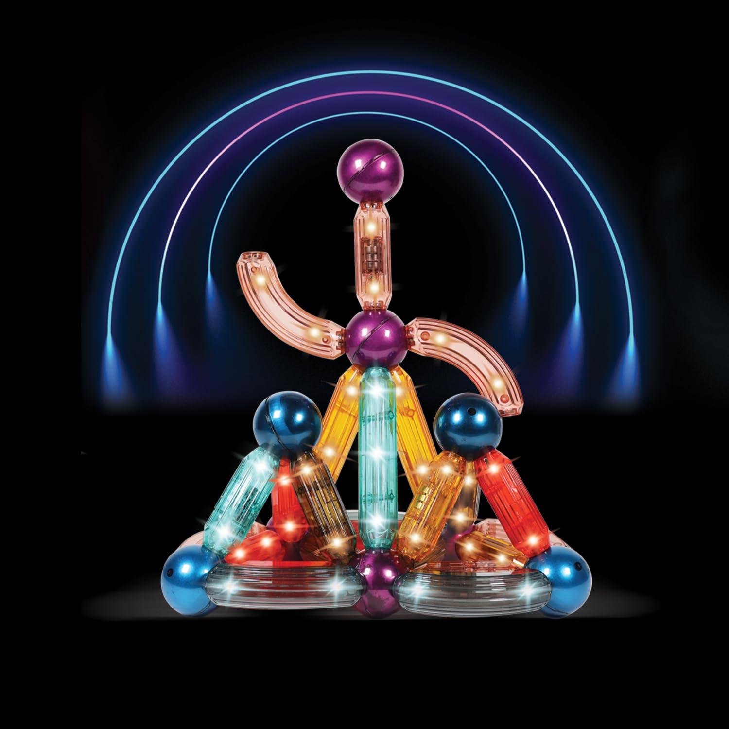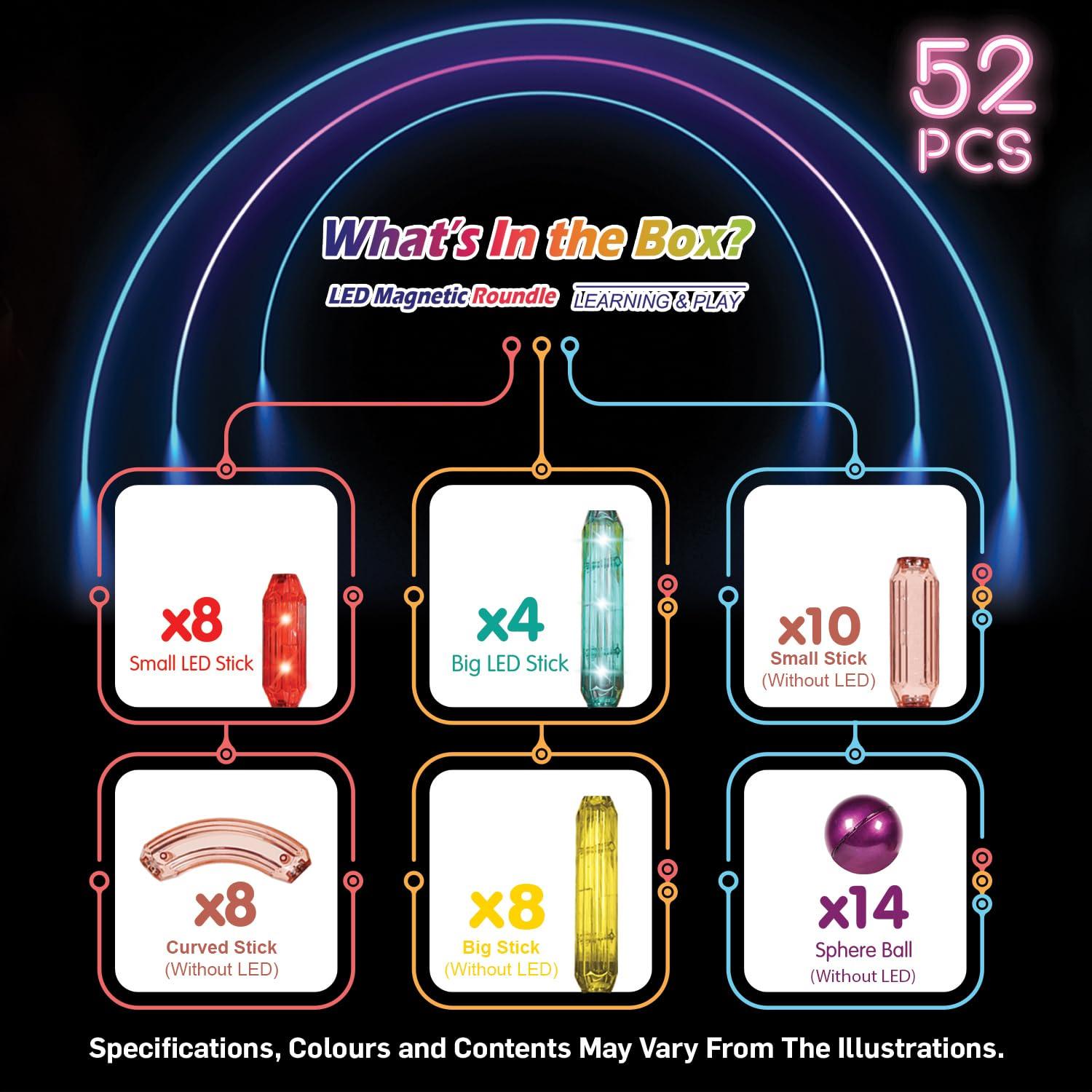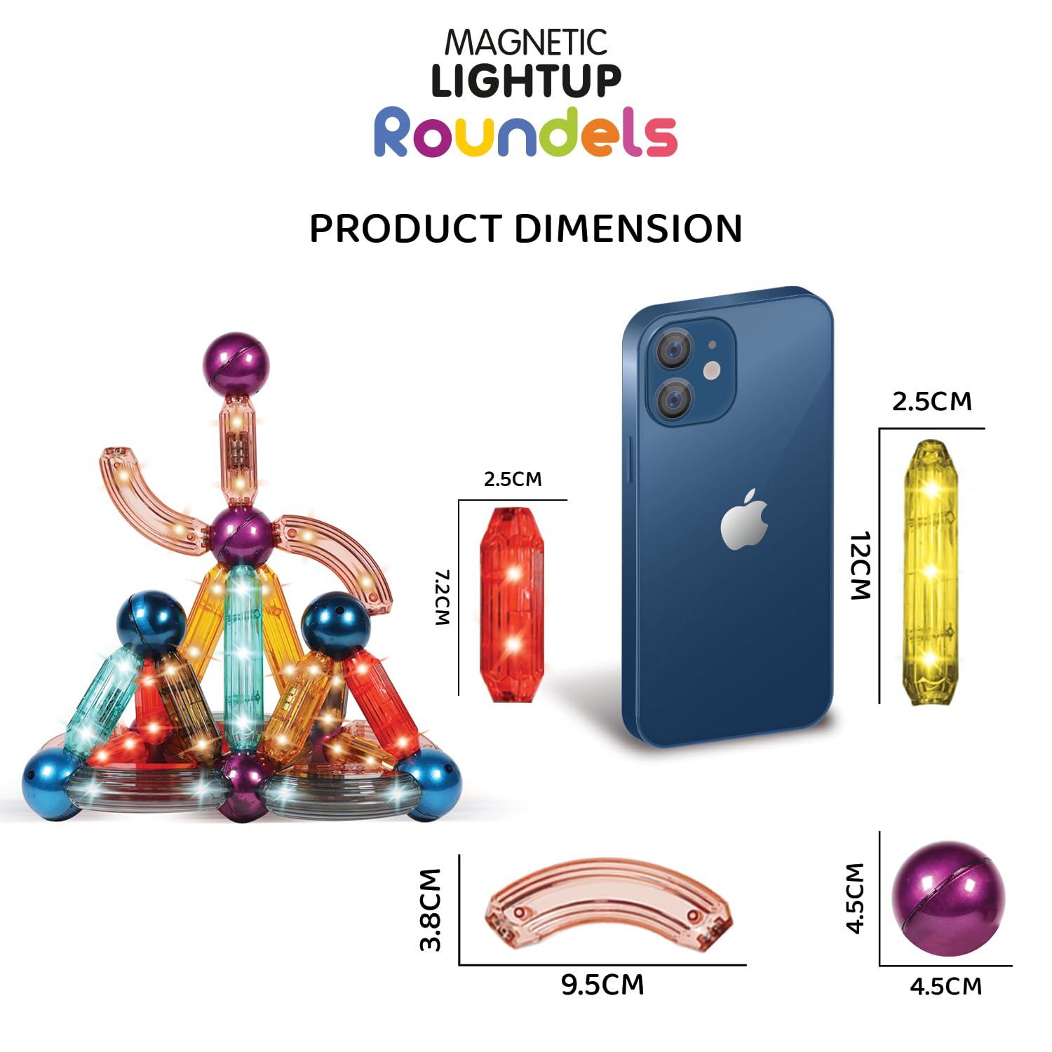 Discover the enchanting world of creativity with Kipa Magplay Magnetic Lightup Roundels, a set of 52 pieces that bring imagination to life! Experience the wonder as transparent colorful sticks and balls illuminate with a mesmerizing glow, adding a captivating touch to each creation. The integrated LED light seamlessly enhances the experience, allowing kids to design, build, and explore while bathed in the magical light. With sticks measuring up to 4.72 inches and curved options for added flair, the potential for crafting intricate structures knows no bounds. Ignite your child’s imaginative thinking as they engineer their own designs, nurturing skills like problem-solving, spatial awareness, and critical thinking. This playful learning adventure not only entertains but also fosters an appreciation for science, engineering, and artistic expression. Crafted for safety and durability, each piece ensures a secure and rewarding playtime. Ideal for birthdays, holidays, and any occasion, this LED sticks and balls set makes for a thoughtful and distinctive gift choice, sparking joy and curiosity in every child.