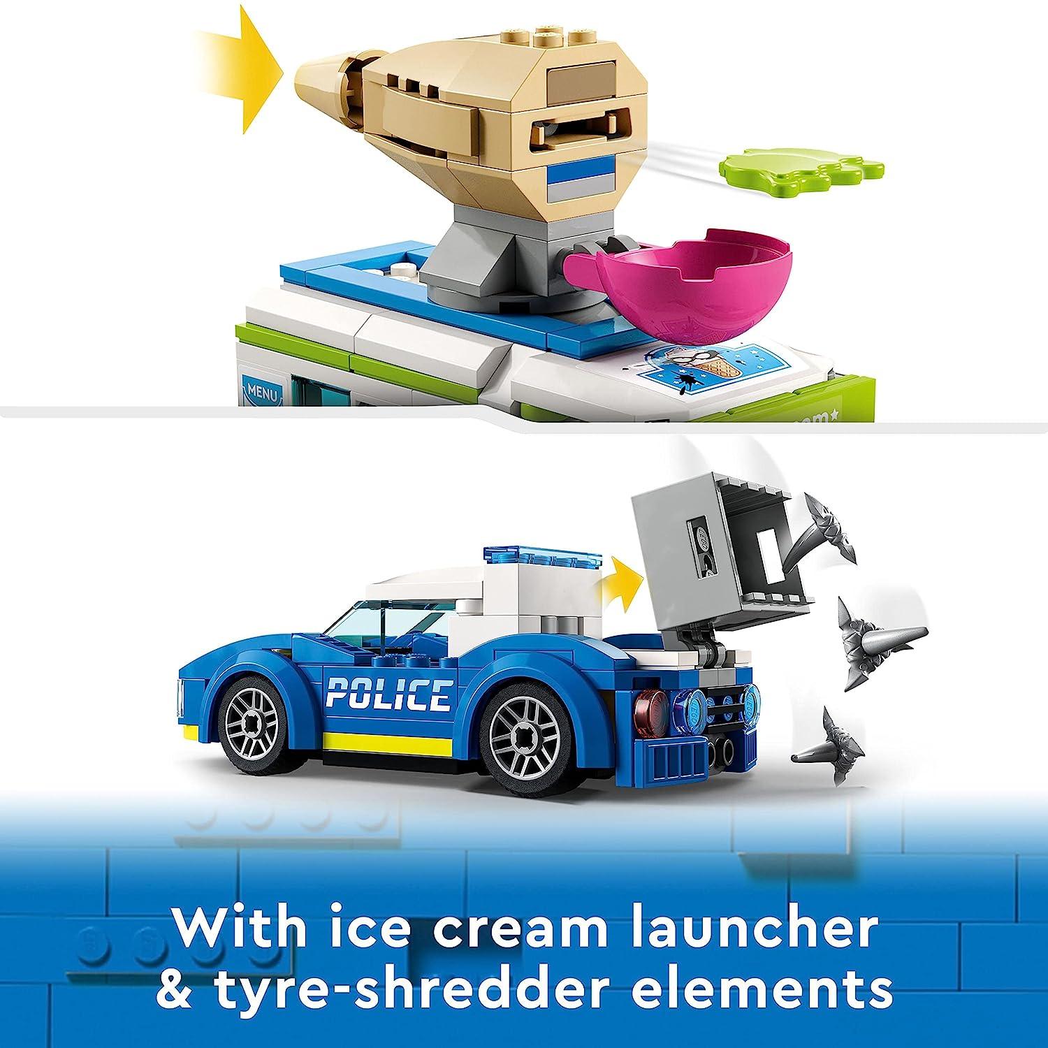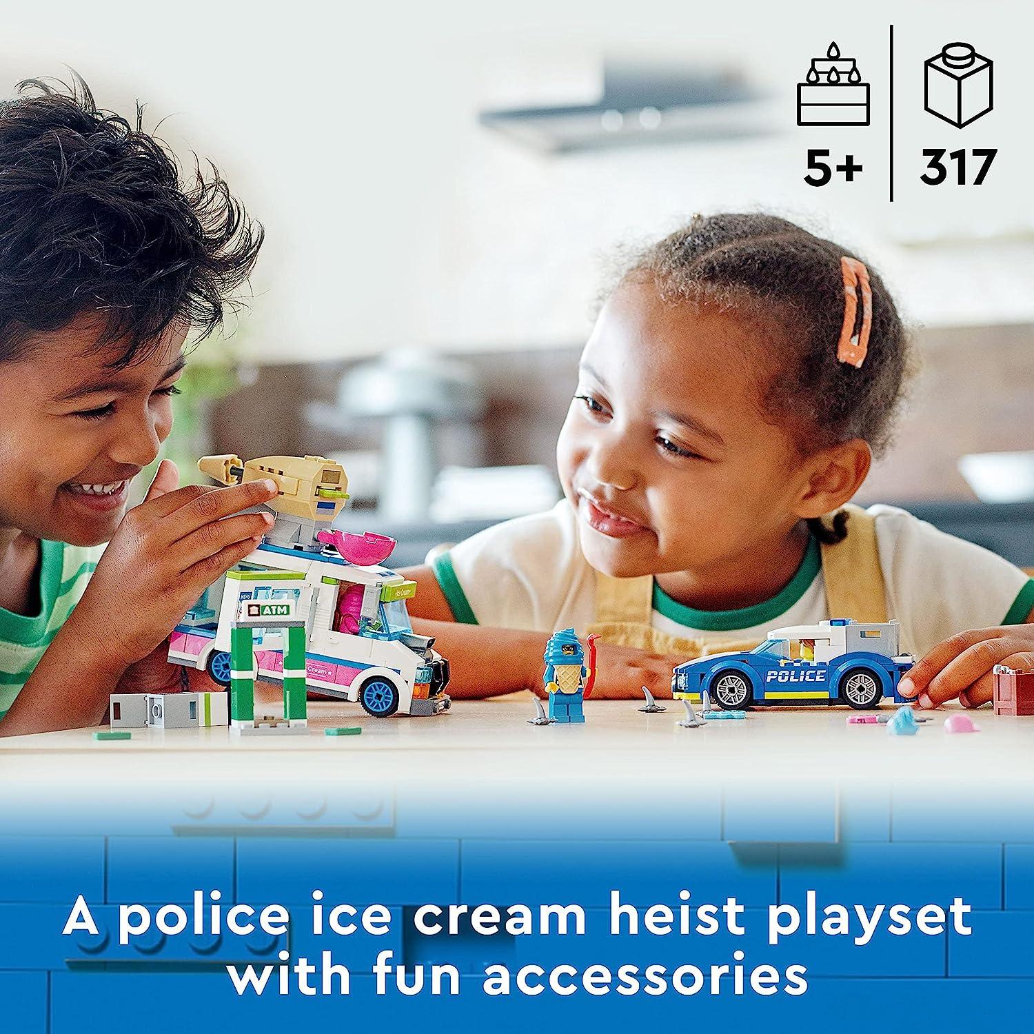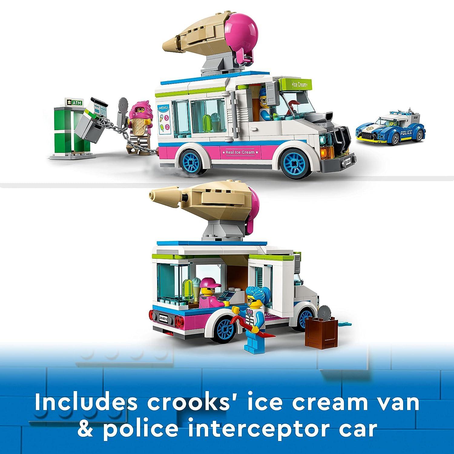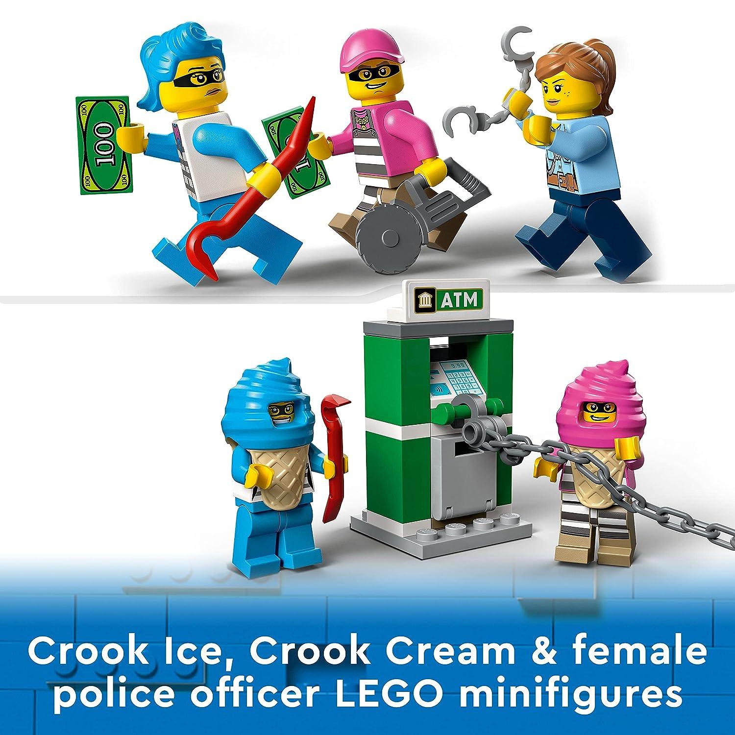 Immerse yourself in the world of LEGO City Adventures with the action-packed LEGO City Ice Cream Van Police Chase (60314) playset, perfect for both kids and devoted fans of the TV series. Unveil endless inspiration within the box, containing all the essentials to construct a vibrant crooks’ ice cream van, a sleek police patrol car, and an ATM setting, accompanied by 3 dynamic minifigures, including 2 iconic LEGO City TV characters. Packed with exciting features, youngsters can unleash splat elements from the ice cream van, deploy tire shredder elements from the police interceptor, and vividly recreate scenes straight from the LEGO City Adventures TV series. An ideal gift for any occasion, be it a birthday, holiday, or just because, this LEGO City Police set captivates children aged 5 and up. With the versatility to serve as both plaything and display piece, the ice cream van, when assembled, stands at over 4.5 inches in height, 5.5 inches in length, and 2 inches in width, promising endless hours of imaginative fun.