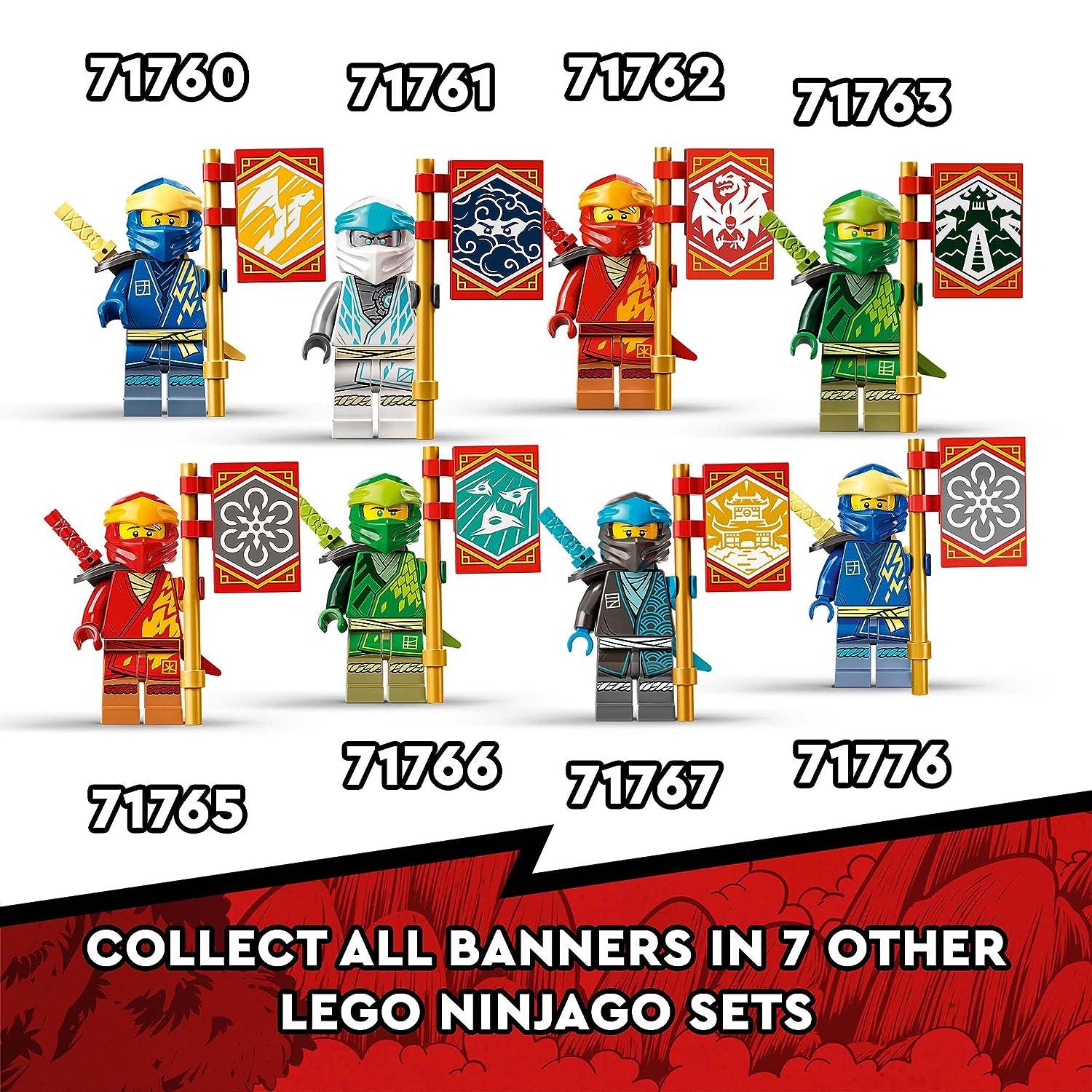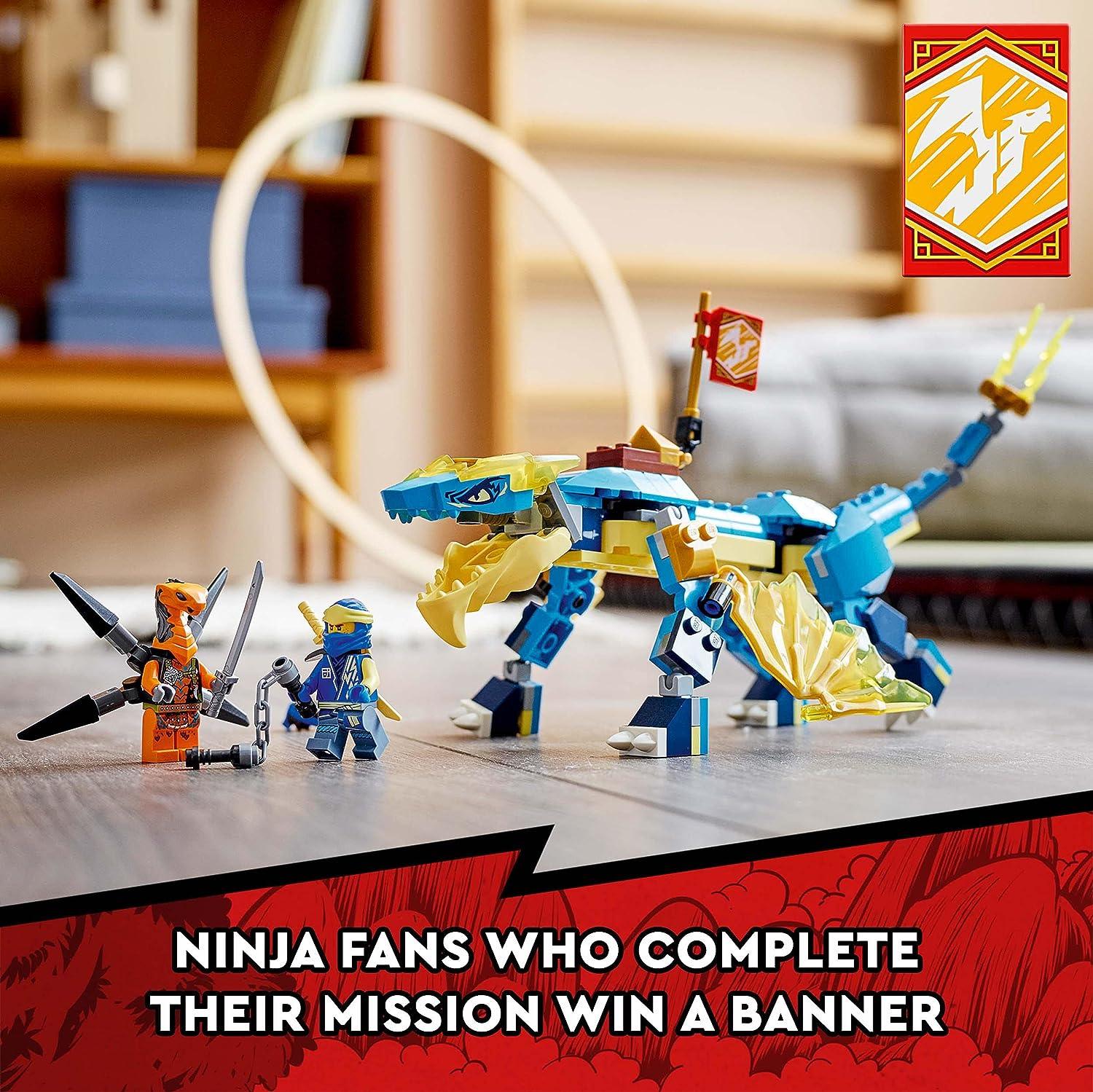 Introducing LEGO Ninjago 71760 – Unleash the power of imagination with this highly posable LEGO NINJAGO Jay’s Thunder Dragon EVO. This set includes 2 minifigures, Jay with nunchucks, who can be customized with a hood and sword, and Viper Flyer armed with a sword and jetpack. The dragon boasts posable legs, head, jaw, wings, a tail for battle, and a saddle for Jay’s epic showdowns against the snake. As a bonus, completing missions and defeating the snake warrior earns kids a collectible Speed banner to proudly display on the dragon. Keep an eye out for banners in 7 other NINJAGO sets, including Zane’s Power Up Mech EVO (71761), Kai’s Fire Dragon EVO (71762), and Lloyd’s Race Car EVO (71763). Dive into the world of ninja action and adventure!