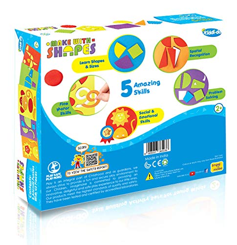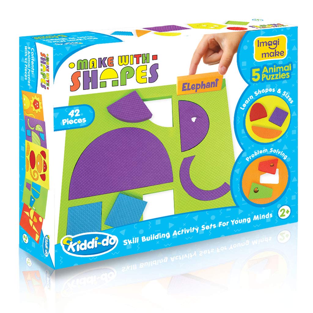The unique Animal themed puzzle is a Montessori style toy that helps toddlers learn about 10 basic shapes (including Semi Circle, Circle, Square, Rectangle & Oval) through the play way method. The set has 5 puzzle boards with 42 total number of pieces. It is a great play set to improve the fine motor skills in kids and teach them about shapes, sizes and colours. The attractive designs of Lion, Elephant, Monkey, Camel and Rhinoceros make it very inviting for kids to keep playing again and again. It even has name blocks for each Animals. Make with Shapes helps enhance spatial recognition and problem-solving skills in children as they understand which shape and which size fits where. Each puzzle is 20 cm x 18 cm (7.5 inch x 7 inch) and uses 8 mm thick pieces of soft, sturdy and safe foam material that complies with European safety standards.