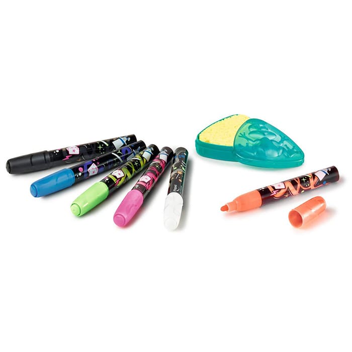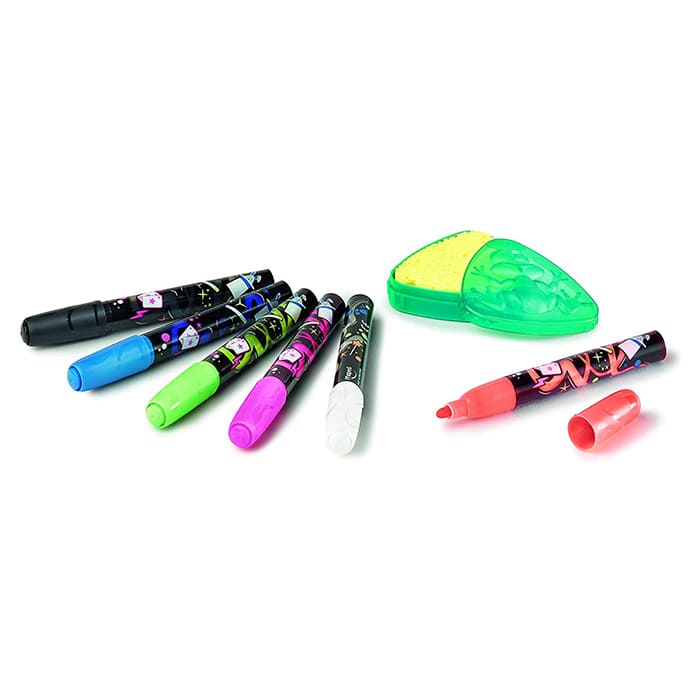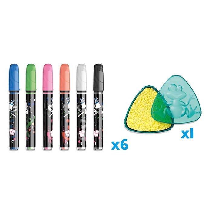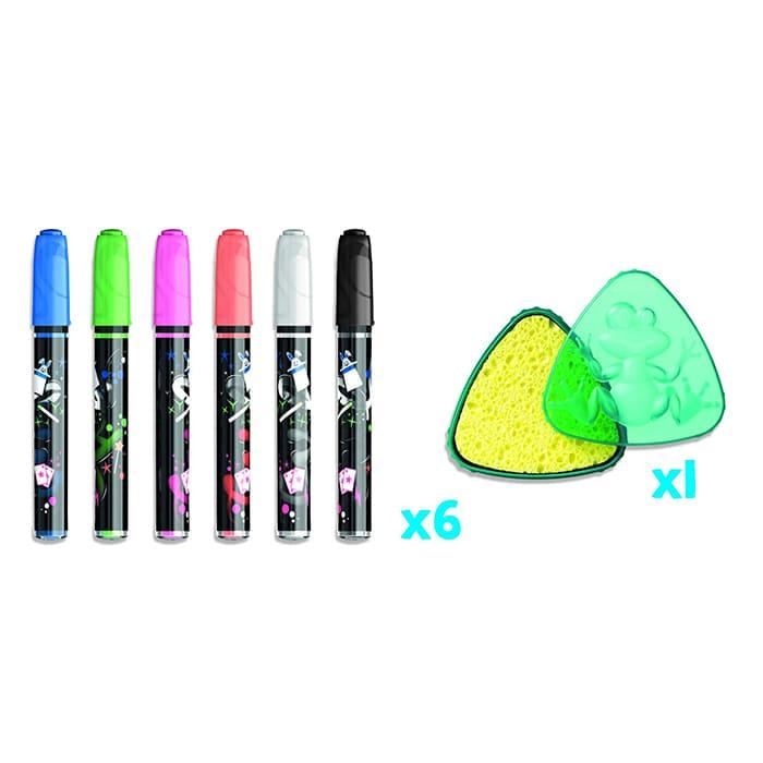 This creative kit includes a set of innovative markers and a sponge. The markers provide vibrant and bold colors, perfect for any project, while the sponge ensures a clean and easy-to-erase surface.