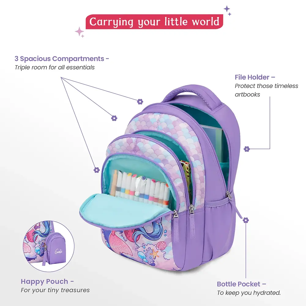 Get ready for school with the Mermaid School Bag! This thoughtfully designed 20L spacious backpack for kids keeps the school gear in order while making a fashion statement with its playful, bright design. From class to the library to a study session with friends, the backpack for school kids has you covered. Equipped with a handy happy pouch for little things, sturdy materials, and roomy spaces, this school bag for kids works wonders for the students.