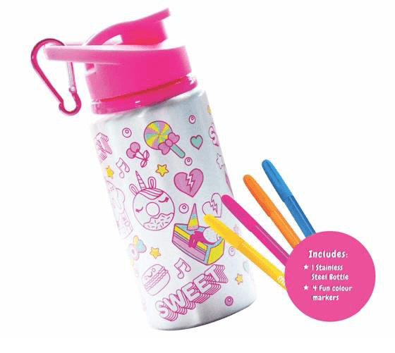 The Mirada Cupcake Bottle is the perfect way to stay hydrated in style. This BPA free stainless steel bottle comes with a kit that includes four markers to make your own cupcake themed bottle.