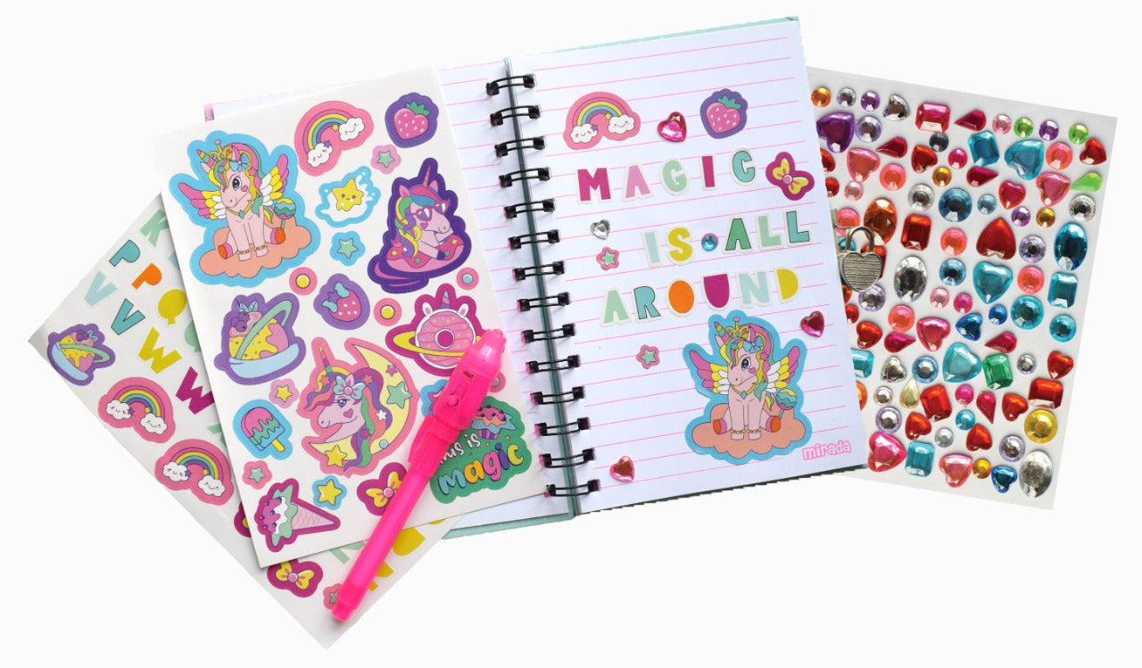 Keep your secrets and dreams close to your heart and hand with this decorate-it-yourself unicorn diary. Includes 190pcs of diary, stickers, secret marker pen, plastic gems, and lock. MIRADA DIY RANGE: Mirada greets you with toys that are fun to choose from and your child is sure to love. Our range embraces a wide variety of products for kids ranging from nail art, tattoo making, hair chalks, scrapbook making, color your own series, and many more products.