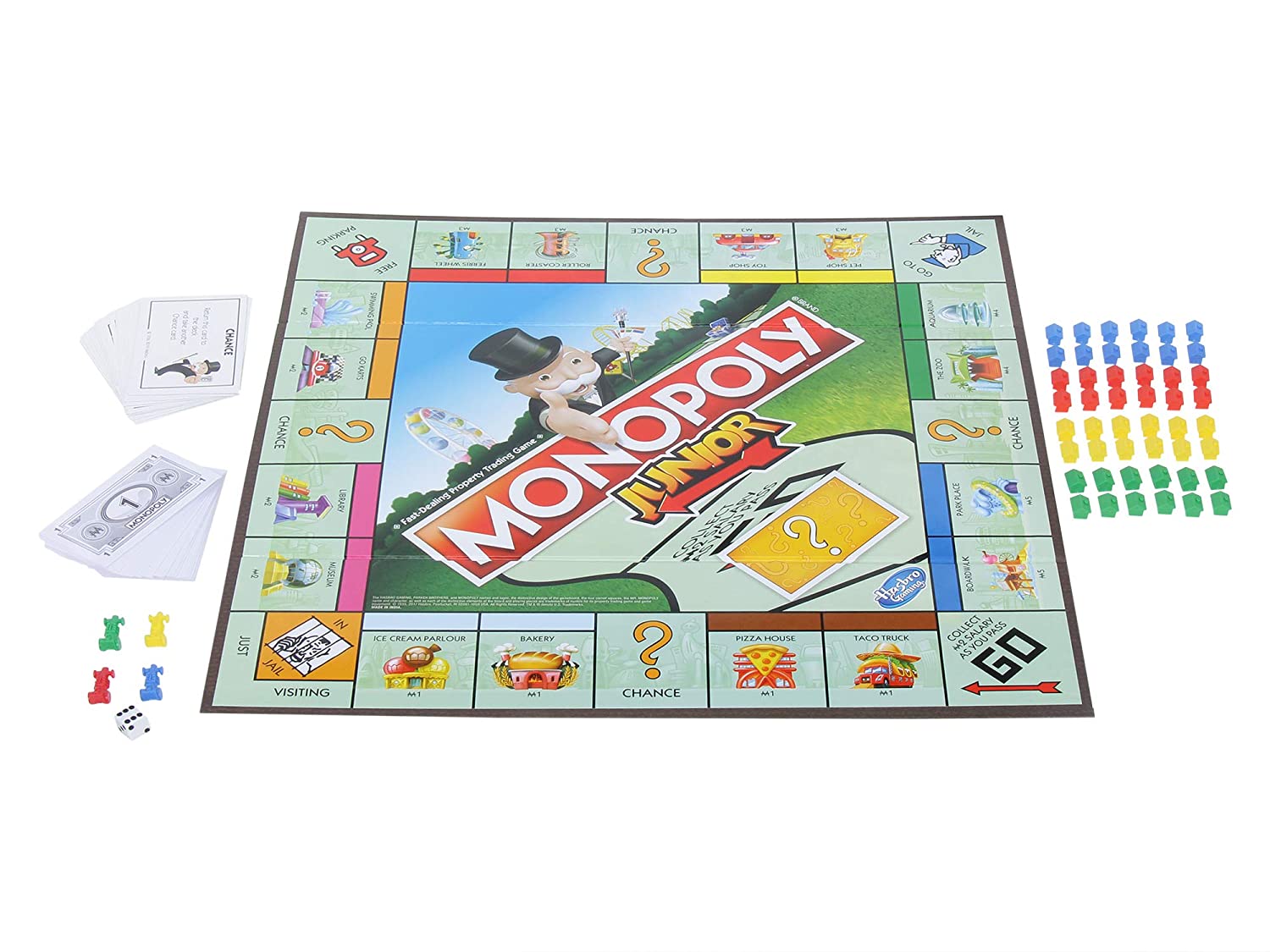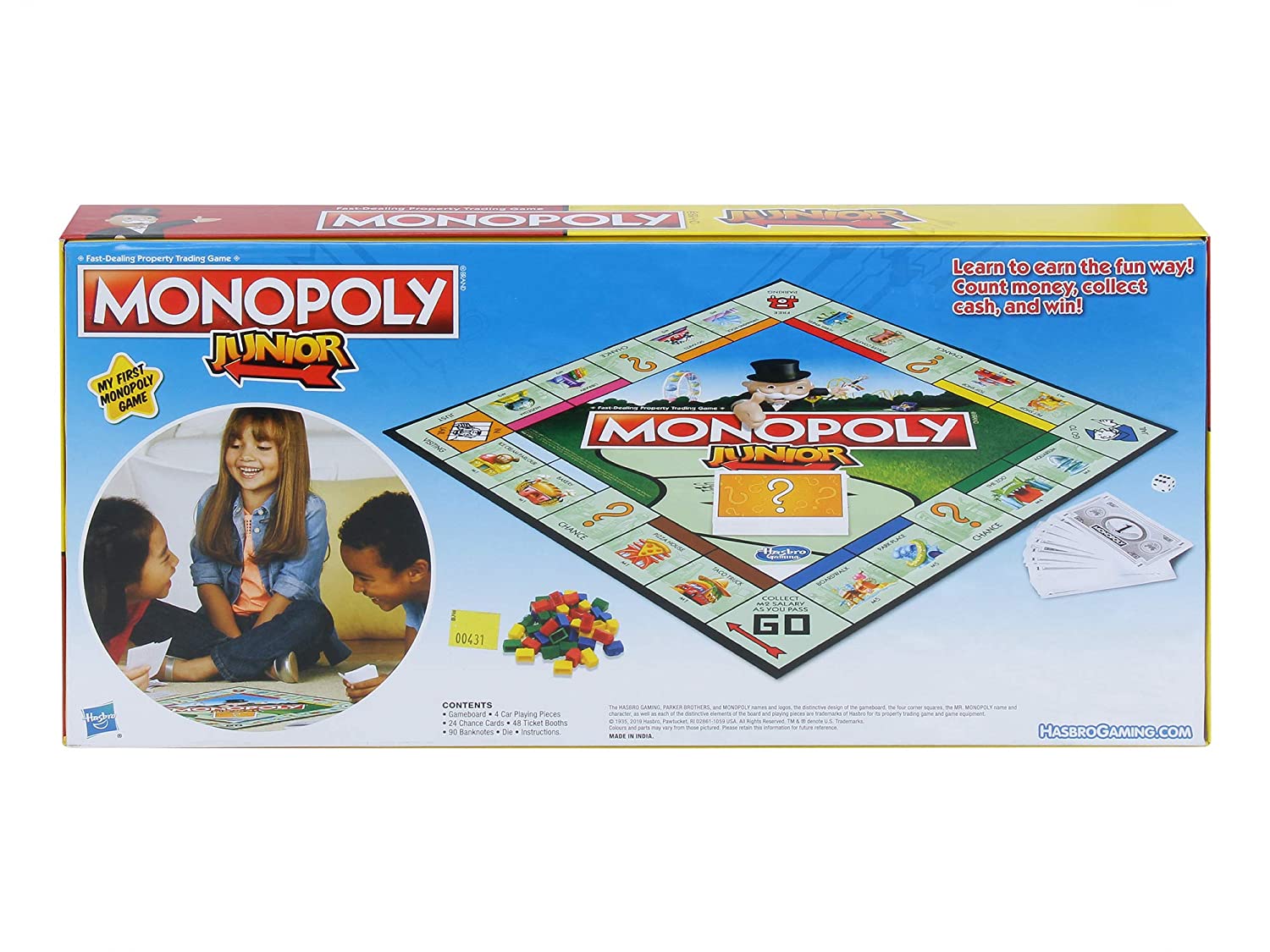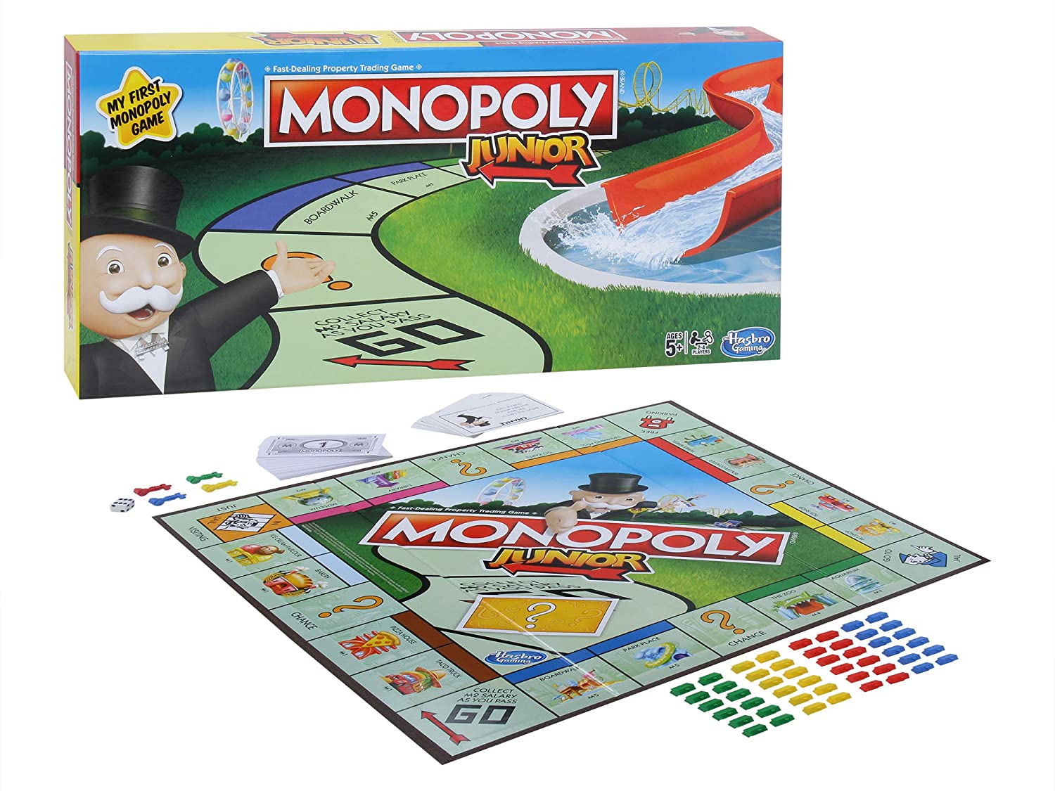 The MONOPOLY junior game is a simple introduction to the iconic MONOPOLY game. With easy and exciting gameplay, kids can have a fun, fast adventure as they move around the board as they journey through the cityscape of MONOPOLY town. Players land on kid-friendly spaces in MONOPOLY town such as the ice cream parlor, the roller coaster, and the zoo, as they buy up properties, collect rent, and discover their fortune. The player with the most money after any other player goes bankrupt wins! The Hasbro, Hasbro gaming, Parker brothers, and MONOPOLY names and logos, the distinctive design of the game board, The four corner squares, the Mr. MONOPOLY name and character, as well as each of the distinctive elements of the board and playing pieces are trademarks of Hasbro for its property trading game and game equipment.